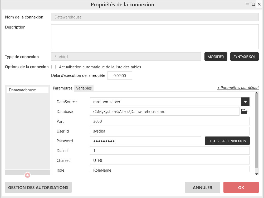 Vous allez pouvoir paramétrer la connexion au Datawarehouse avec les types de connexions suivants :