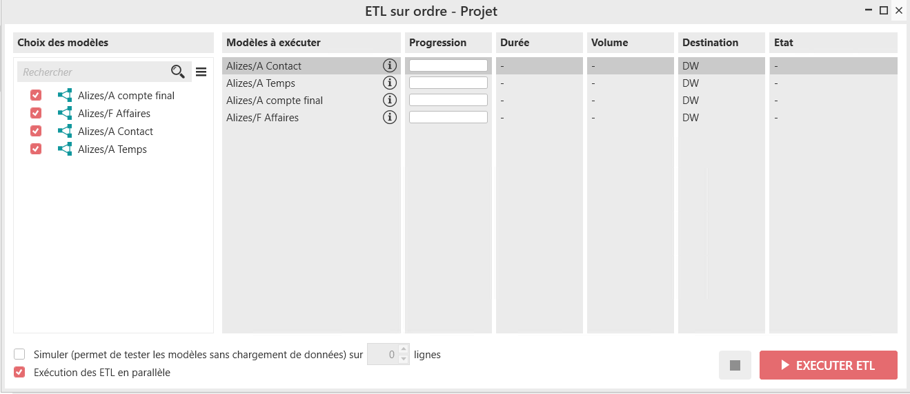 Vous accédez alors à l’interface « ETL sur ordre », cochez les modèles dans la partie « Choix des modèles » puis cliquer sur le bouton « EXECUTER ETL » :