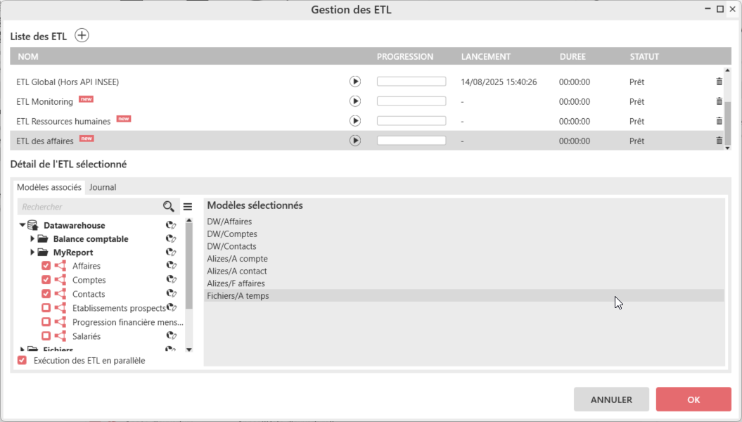 Par défaut, les ETL s’exécutent en parallèle (case à cocher «·Exécution des ETL en parallèle·»).