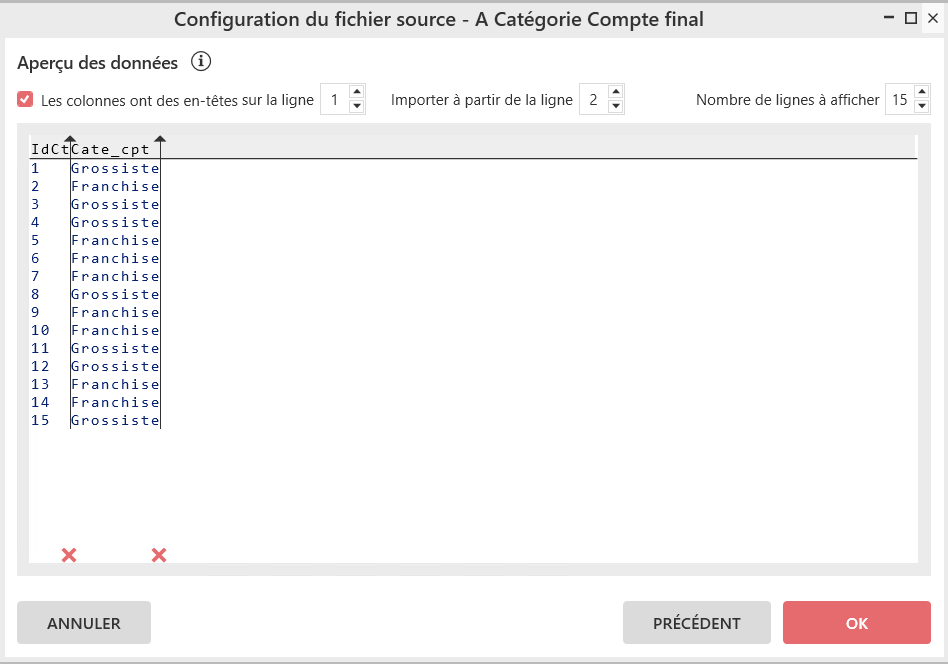 Préciser si les colonnes ont un en-tête, si oui sur quelle ligne est l'en-tête