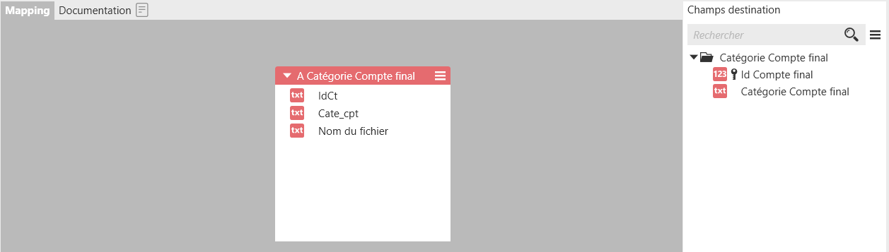 Dans les champs destination, créez un dossier « Catégorie Compte final », et faites glisser les « IdCt » et « Cate_cpt » en les renommant et en les qualifiant pour obtenir le résultat suivant :