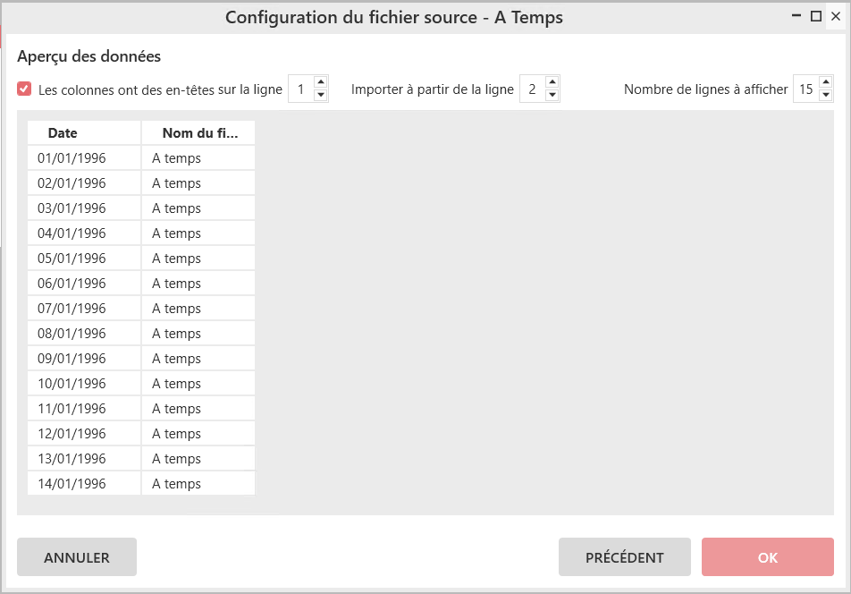 Le paramétrage par défaut convient pour le fichier « A temps.txt ».