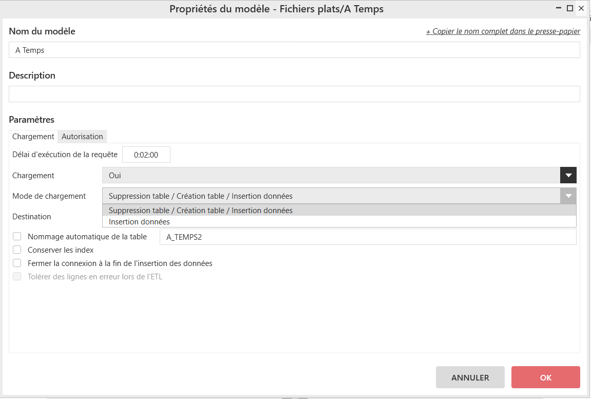 Si vous avez choisi de charger le modèle de fichier, vous disposez de 2 modes de chargement :
