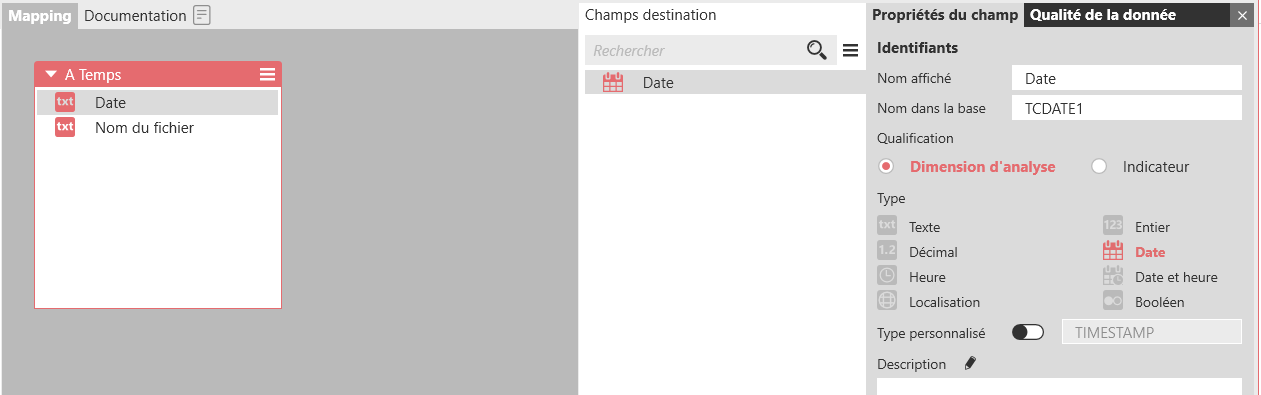 Si vous glissez/déposez ce champ dans l’espace des champs destination, vous obtenez un champ qui est de type Date compte tenu de la structure de ses données.