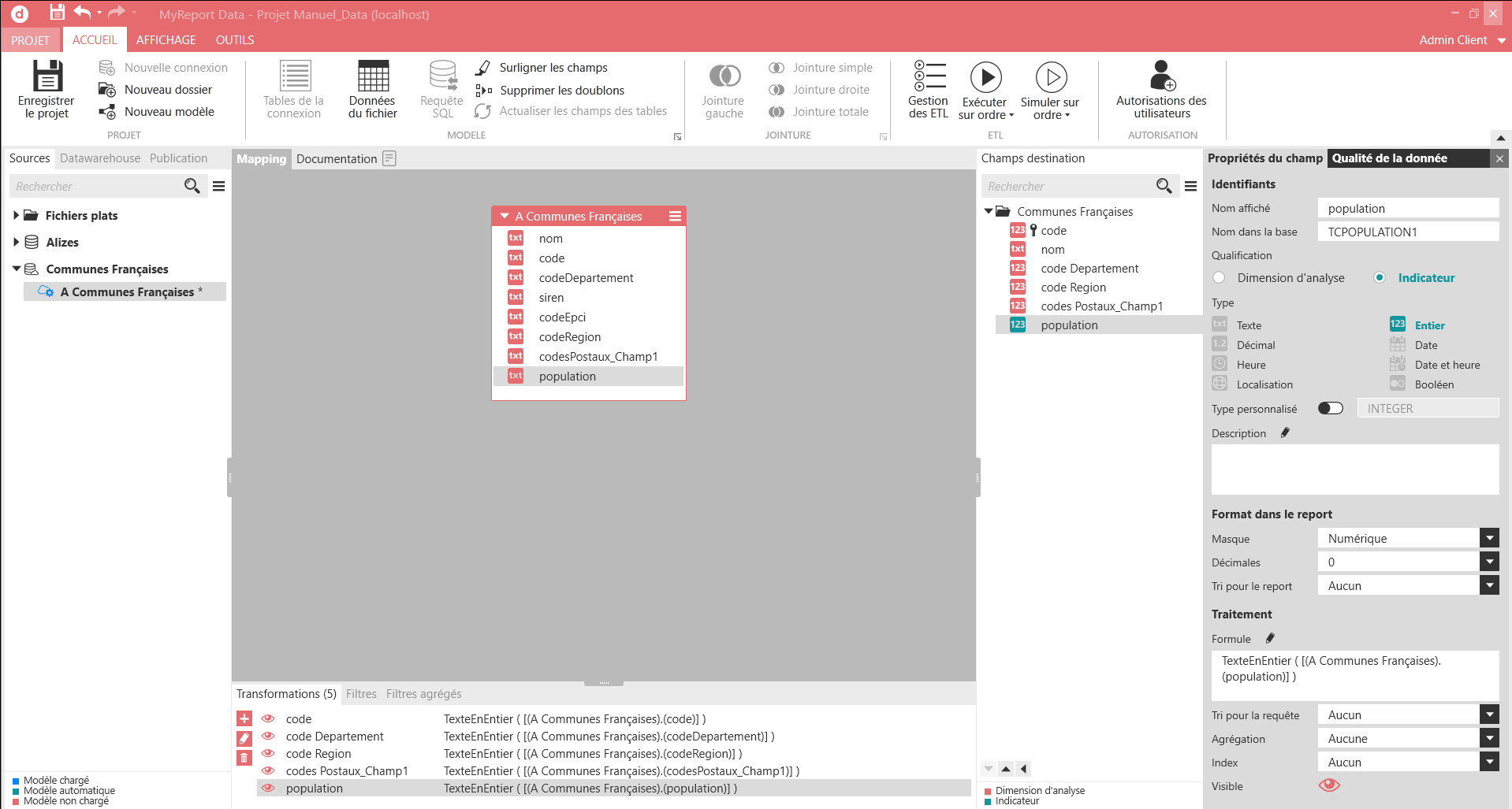 - Ajoutez les « Champs destination » du modèle et typer les champs :