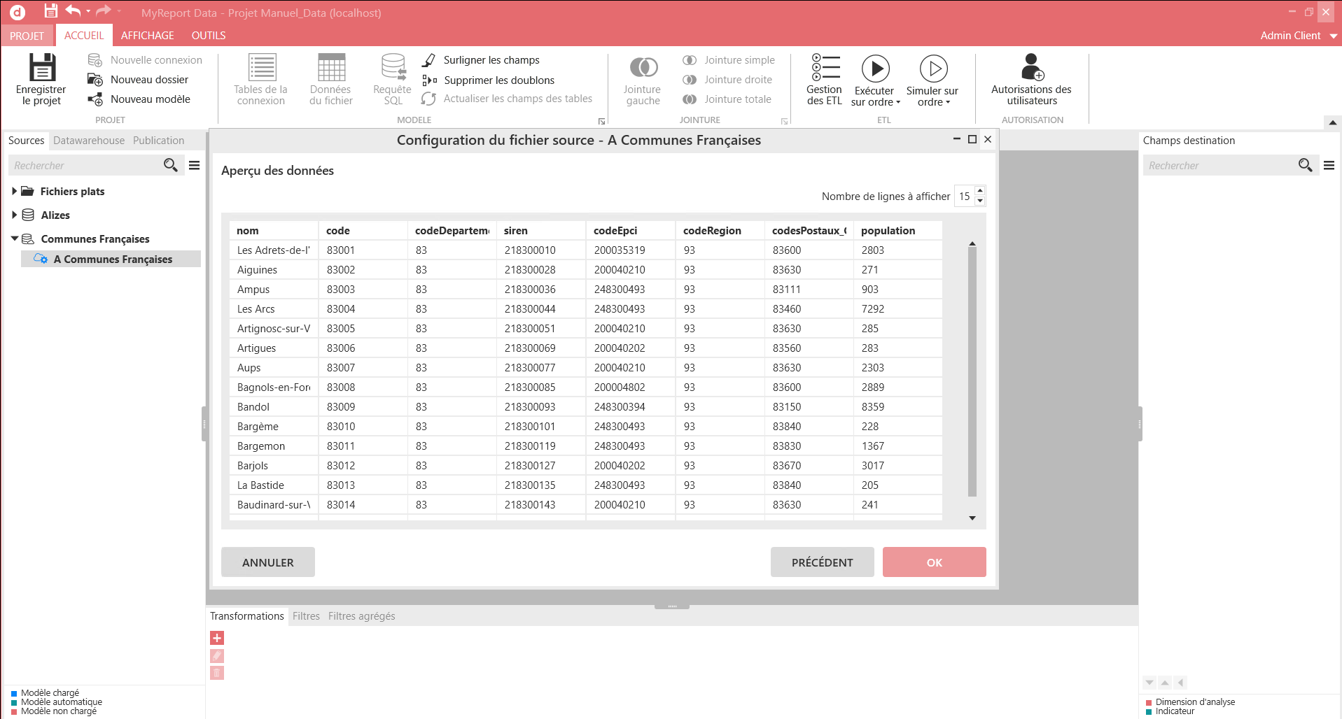 - Cliquez sur les boutons « Suivant » pour obtenir un aperçu des données (Pour rappel, dans l'exemple ci-dessous, nous avons filtré seulement les données du Var) :
