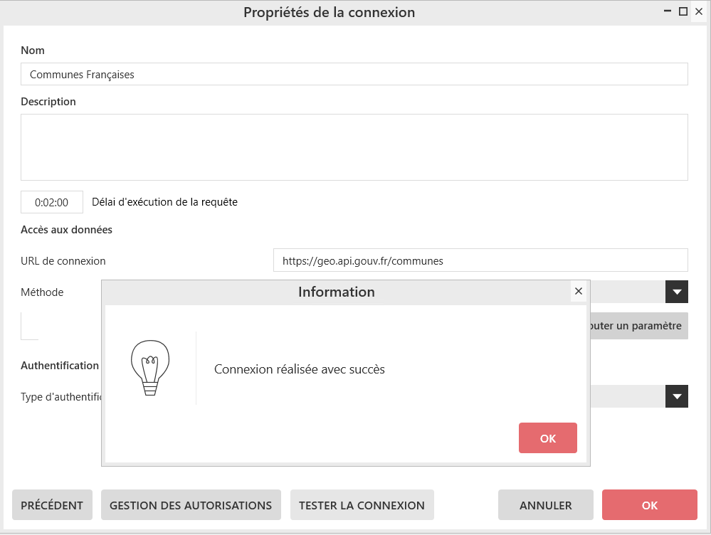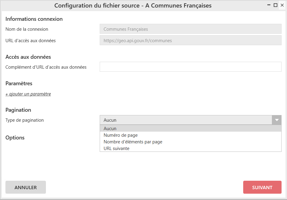 - Renseignez l’URL d’accès aux données : par exemple https://geo.api.gouv.fr/communes