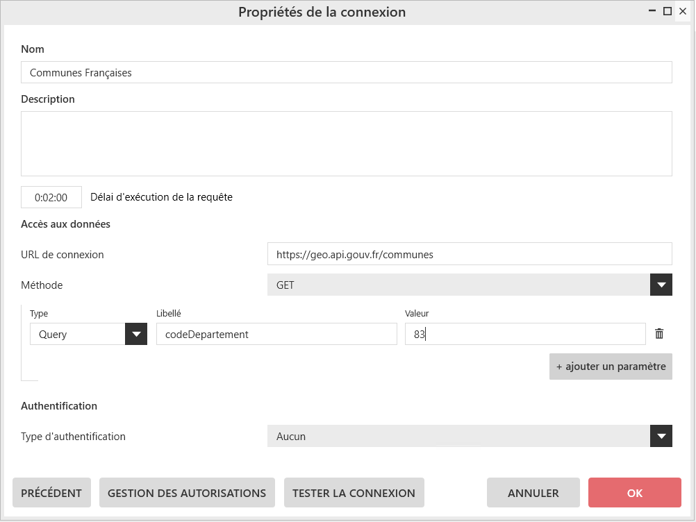 - Paramètres : il est possible d’ajouter des paramètres supplémentaires pour filtrer les données en cliquant sur « Ajouter un paramètre ». Se référer à la documentation du WebService utilisé. Dans l’exemple ci-dessous, nous sélectionnons l’ensemble des communes du Var (Query codeDepartement = 83) . Ses paramètres peuvent aussi être directement ajoutés en complément d'URL d'accès aux données.