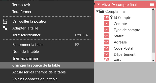 Dans l’espace de mapping, cliquez droit sur la table « Alizes/A Compte final » et sélectionnez « Changer la source de la table »