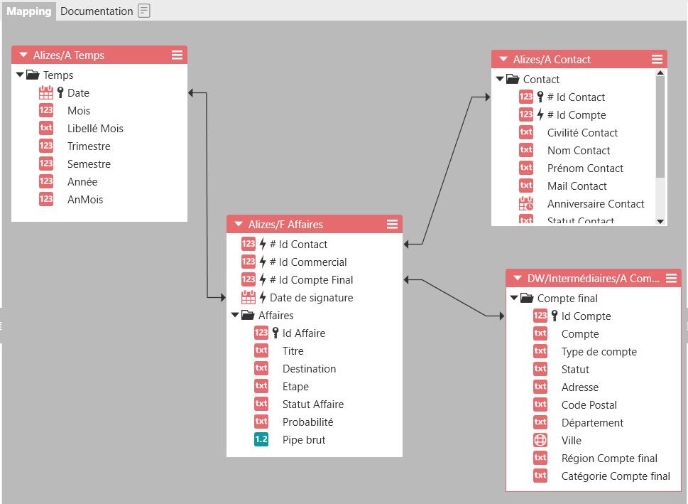 Dans la connexion « Alizes », nous accédons à des données provenant de Firebird. Pour pouvoir relier des données de Firebird avec les données du fichier plat, nous allons passer par un modèle intermédiaire dans la connexion Datawarehouse.