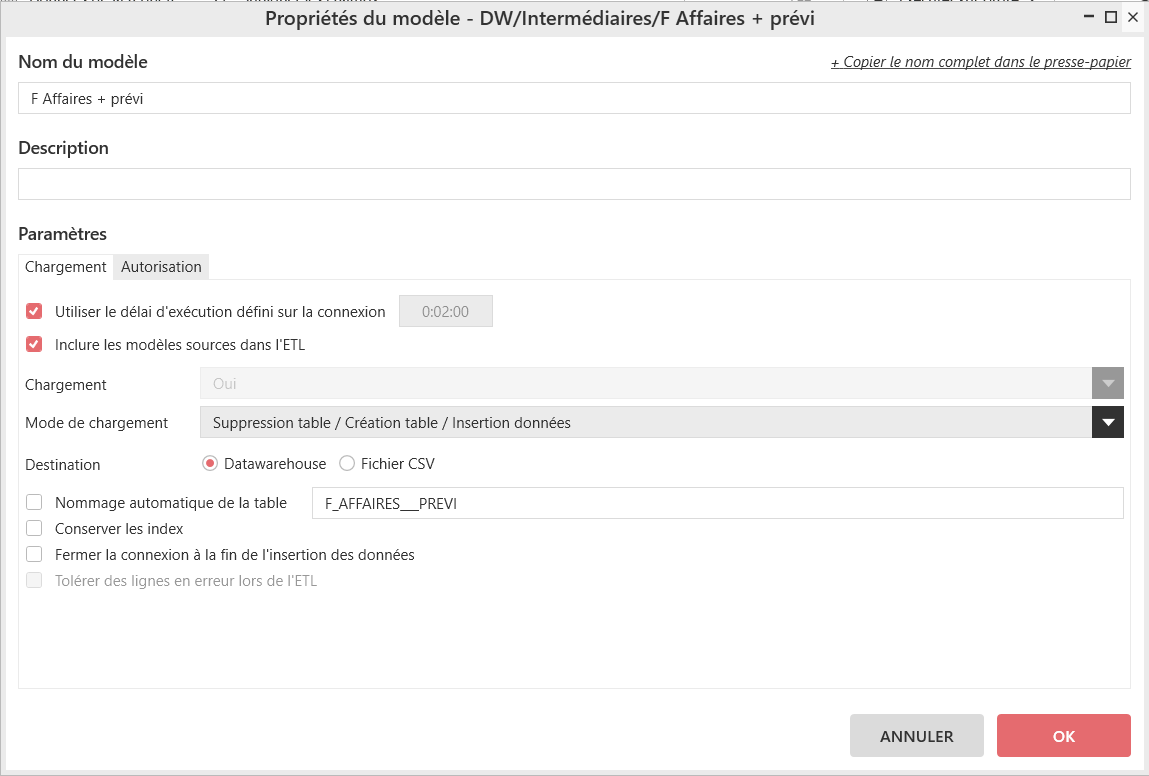 Pour le constater, ouvrez les propriétés du modèle « DW/Facturation intermédiaire/F Affaires + previ ». Vous constatez qu’il n’est pas possible de sélectionner une autre valeur que Oui pour le Chargement (la liste déroulante est d'ailleurs grisée).
