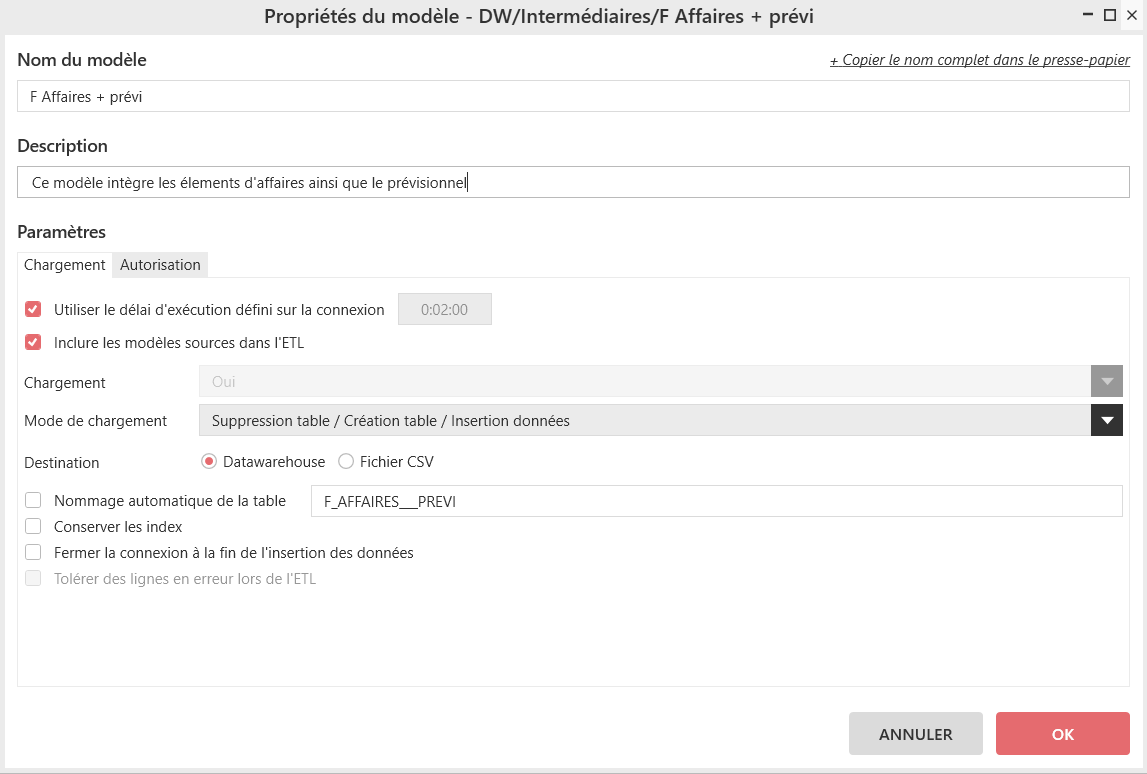 Dans le bloc « Description », saisissez le texte suivant : « Ce modèle intègre les éléments d'affaires ainsi que le prévisionnel »