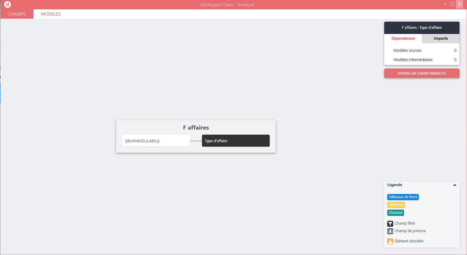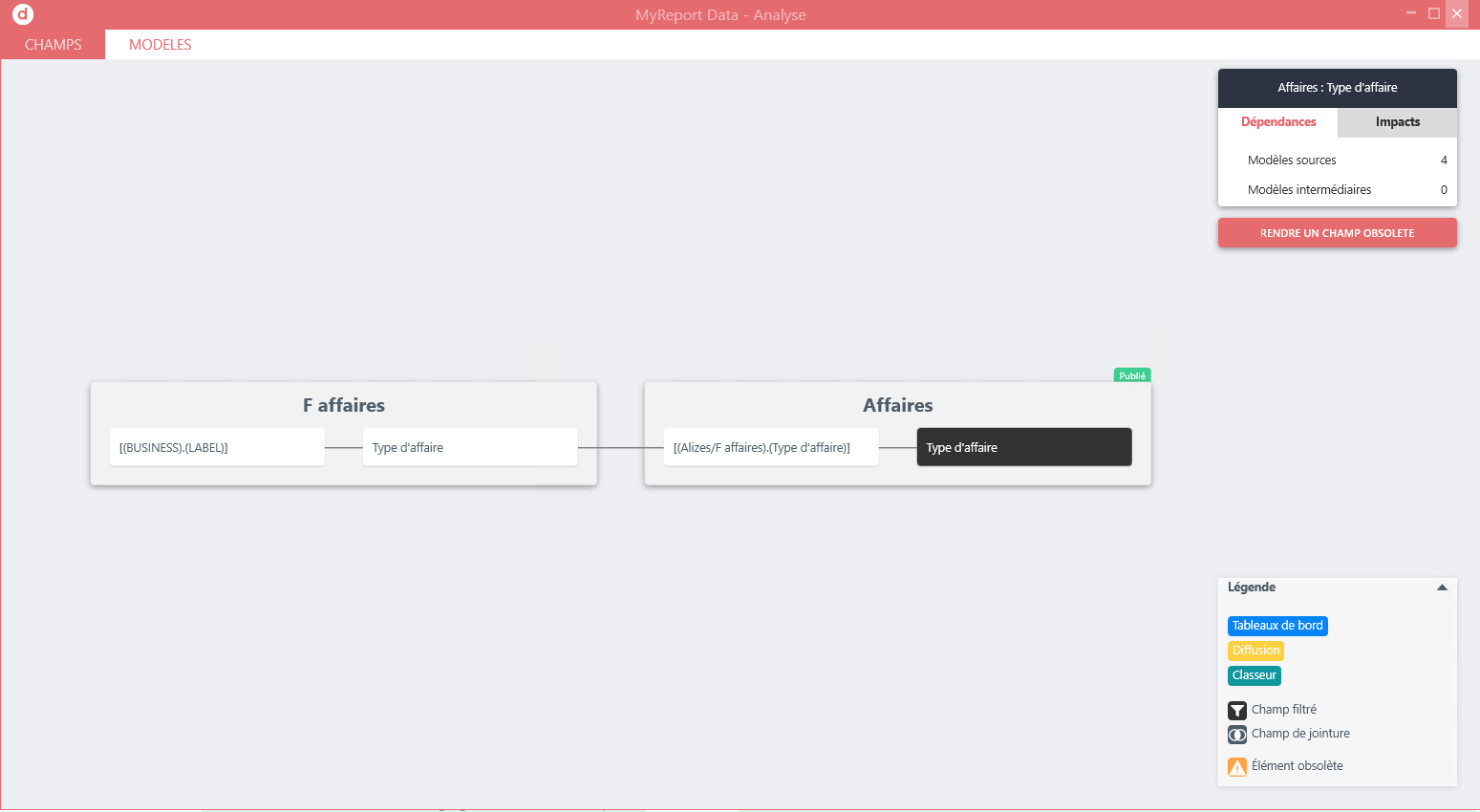Au milieu de la fenêtre est représenté le champ Type d'affaire dans le modèle F affaires et dans le modèle en étoile Affaires ainsi que les tableaux de bord dans lesquels le champ est utilisé et la diffusion (car ici ce champ est utilisé seulement dans des tableaux de bord et une diffusion).