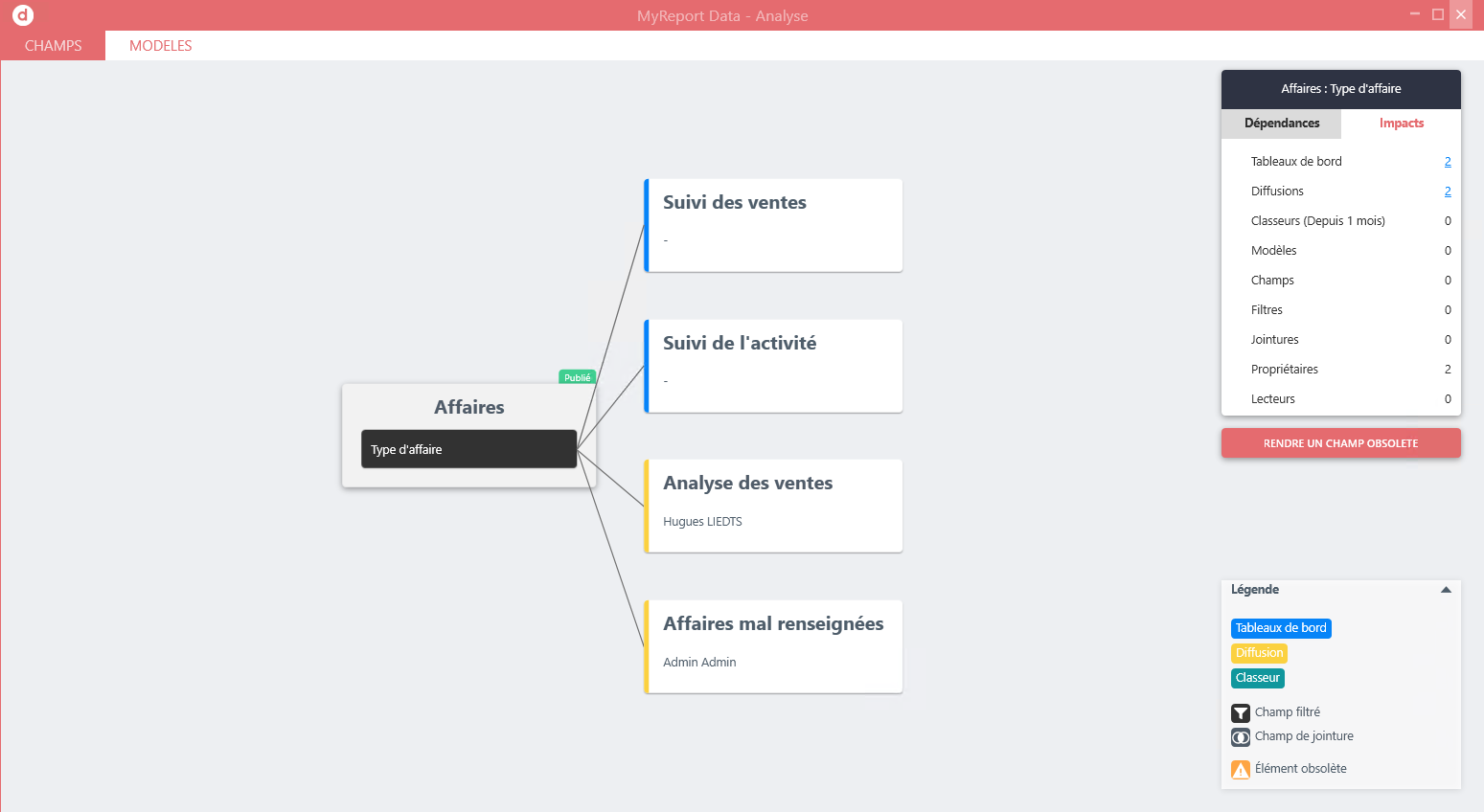 Vous pouvez retrouver l'impact du champ en faisant un clic droit dessus et en cliquant sur Analyser l'impact du champ