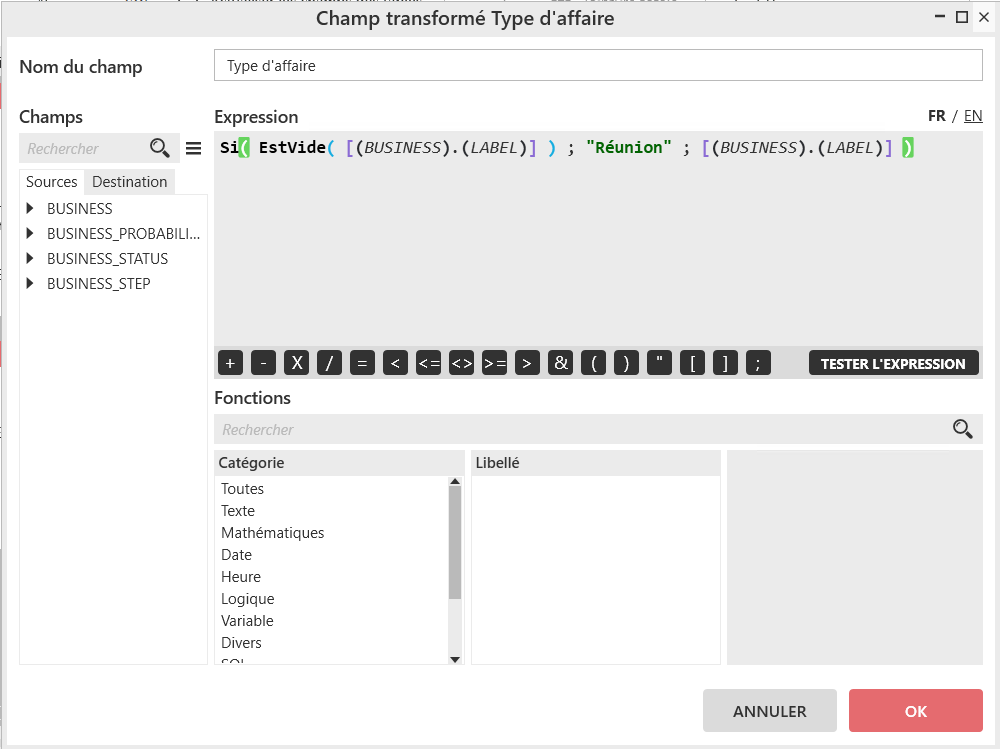 Ensuite, vous allez créer sur le modèle source F affaires, un nouveau champ nommé Type affaire dont la formule sera la suivante : Si( EstVide( [(BUSINESS).(LABEL)] ) ; "Réunion" ; [(BUSINESS).(LABEL)] )