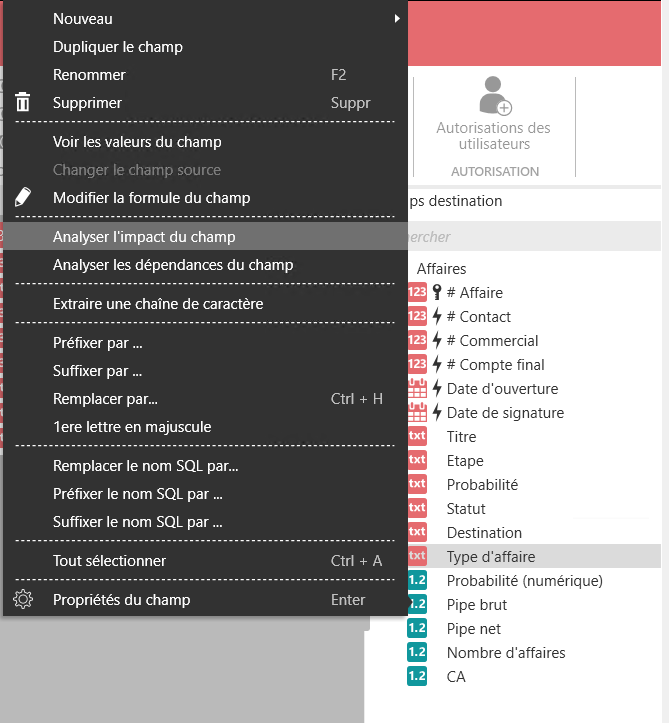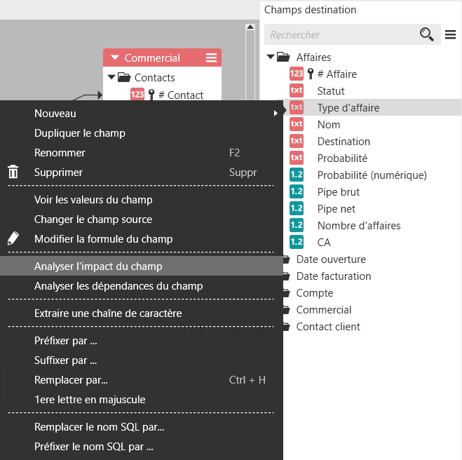 D'abord, vous allez regarder ce que cela va impacter. Pour cela, faites clic droit sur le champ Type Affaire du modèle Affaires et sélectionnez Analyser l'impact du champ.