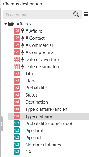 Vous obtenez dans les champs destination deux champs pour le type d'affaire : Type d'affaire (ancien) et Type d'affaire