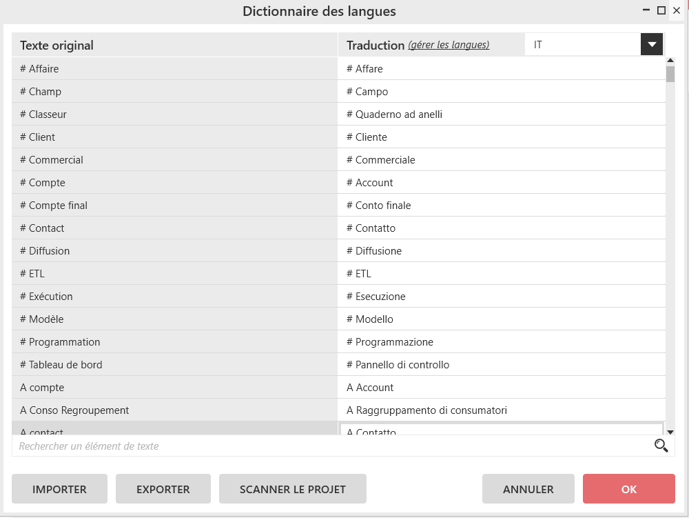 Cliquez sur SCANNER LE PROJET pour importer les champs à traduire.