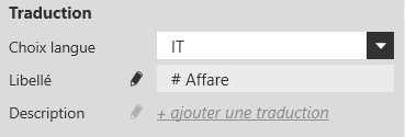 Dans les propriétés des champs, une nouvelle zone permet de choisir la langue et de voir ou modifier la traduction. Ou de traduire sa description s’il en a une.
