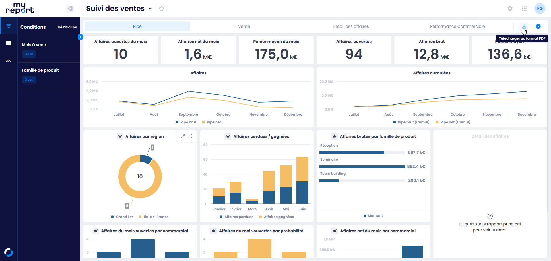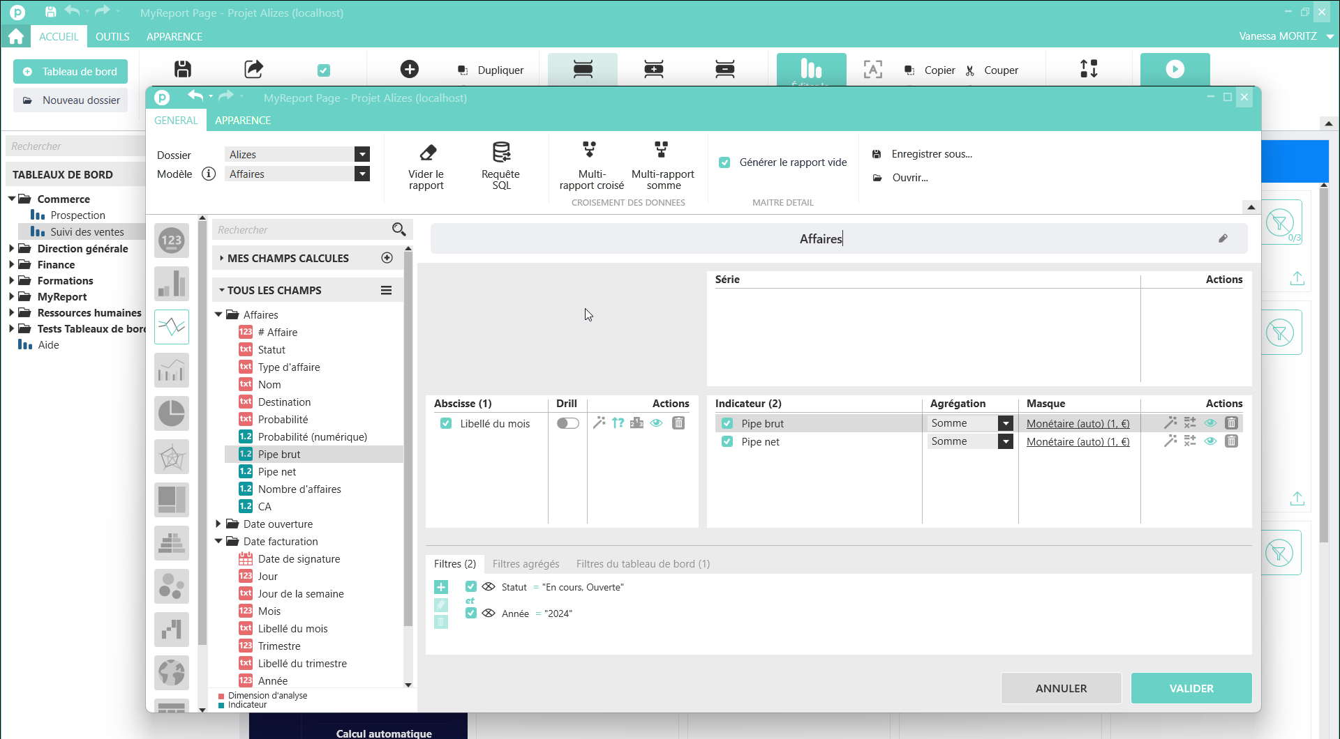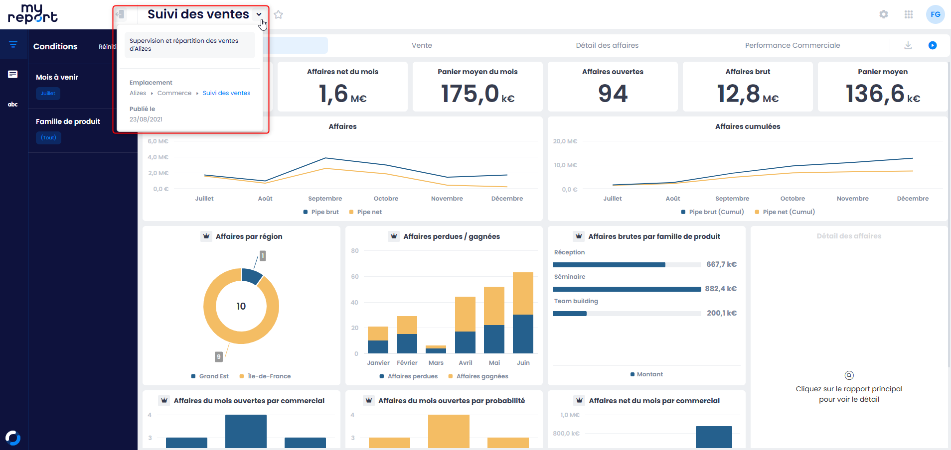 Voici par exemple, dans le projet Alizés, dossier Commerce, le tableau de bord Suivi des ventes et ses conditions à gauche :