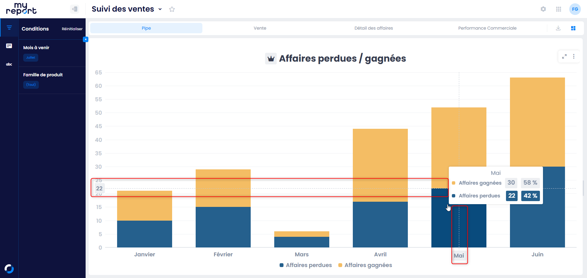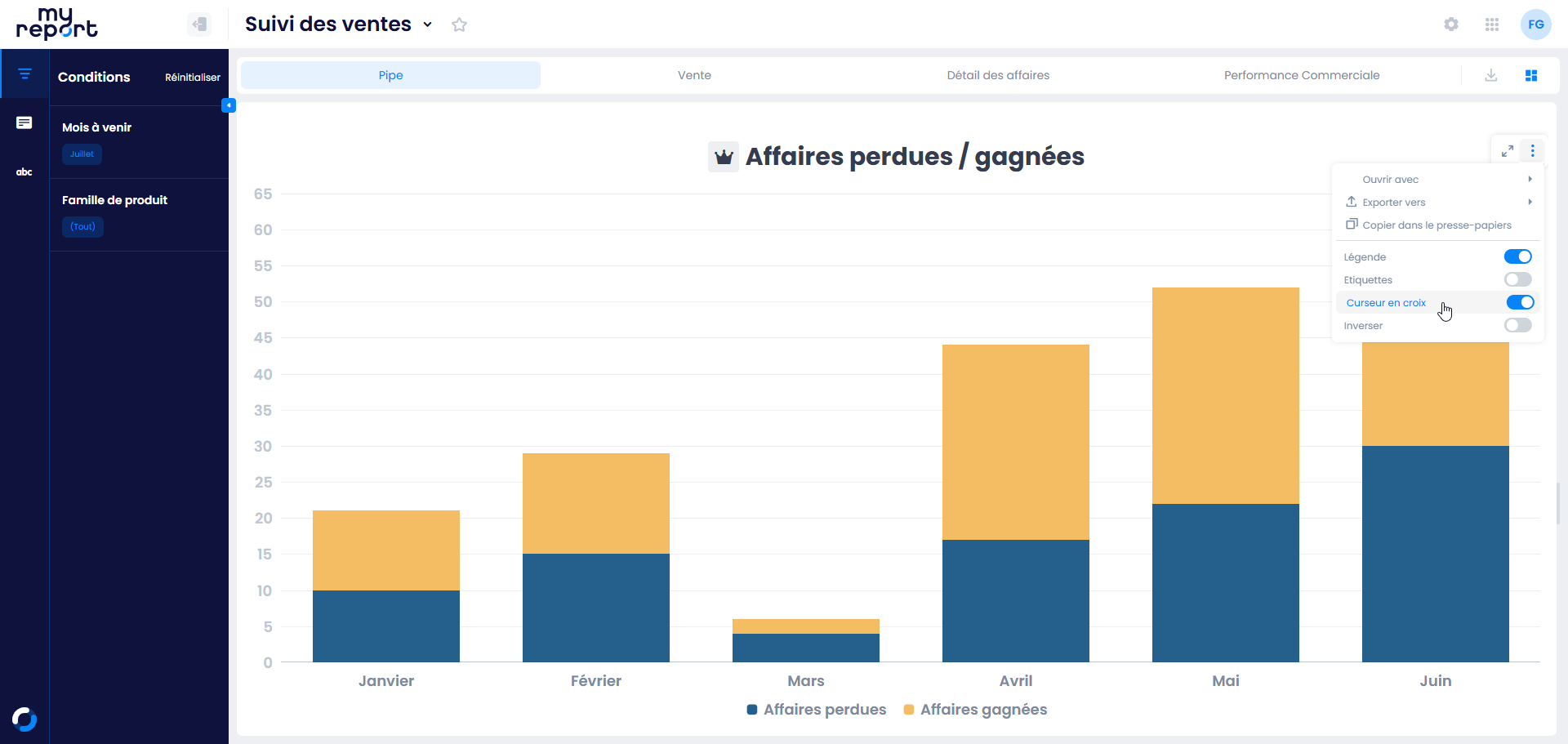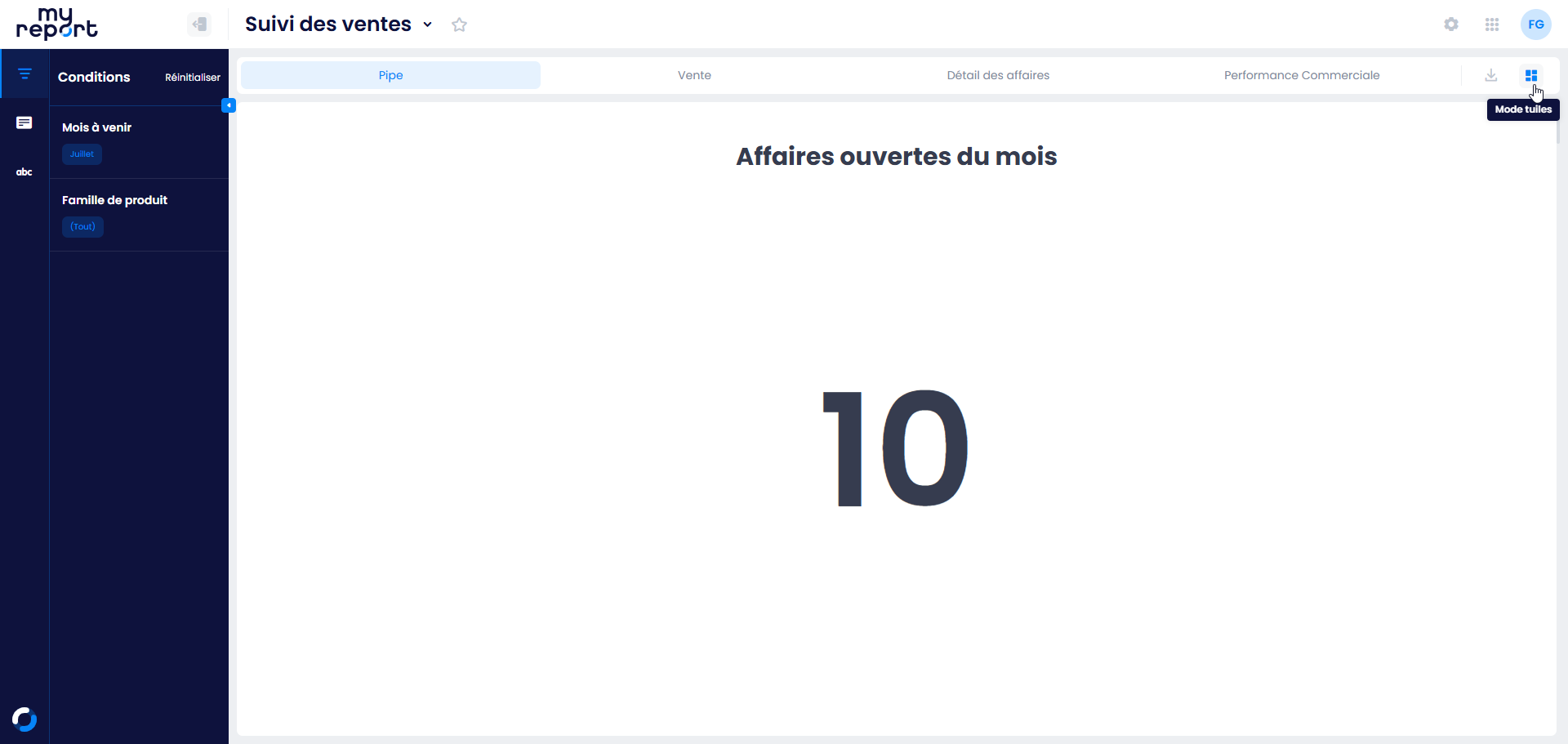 Voici par exemple, dans le projet Alizés, dossier Commerce, le tableau de bord Suivi des ventes et ses conditions à gauche :