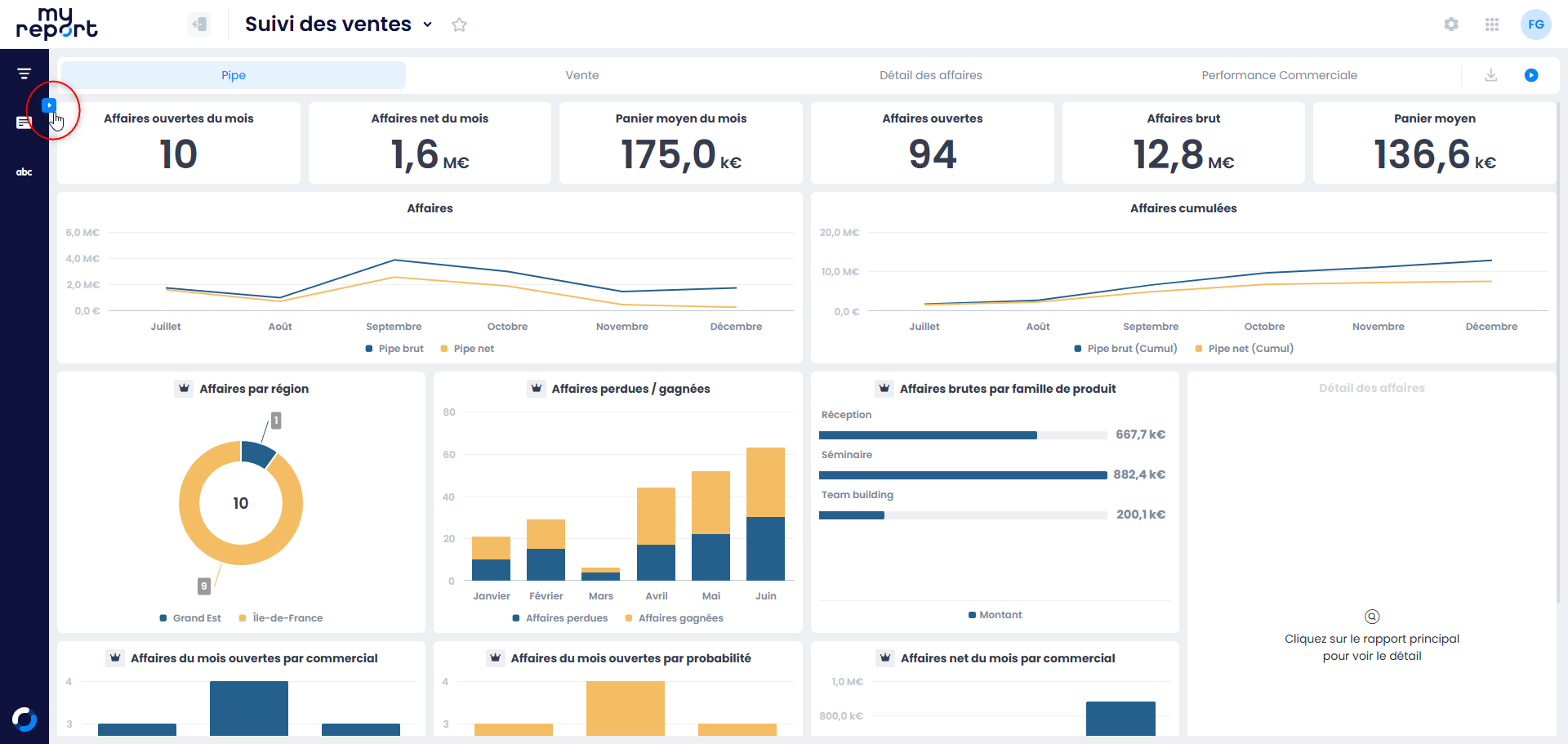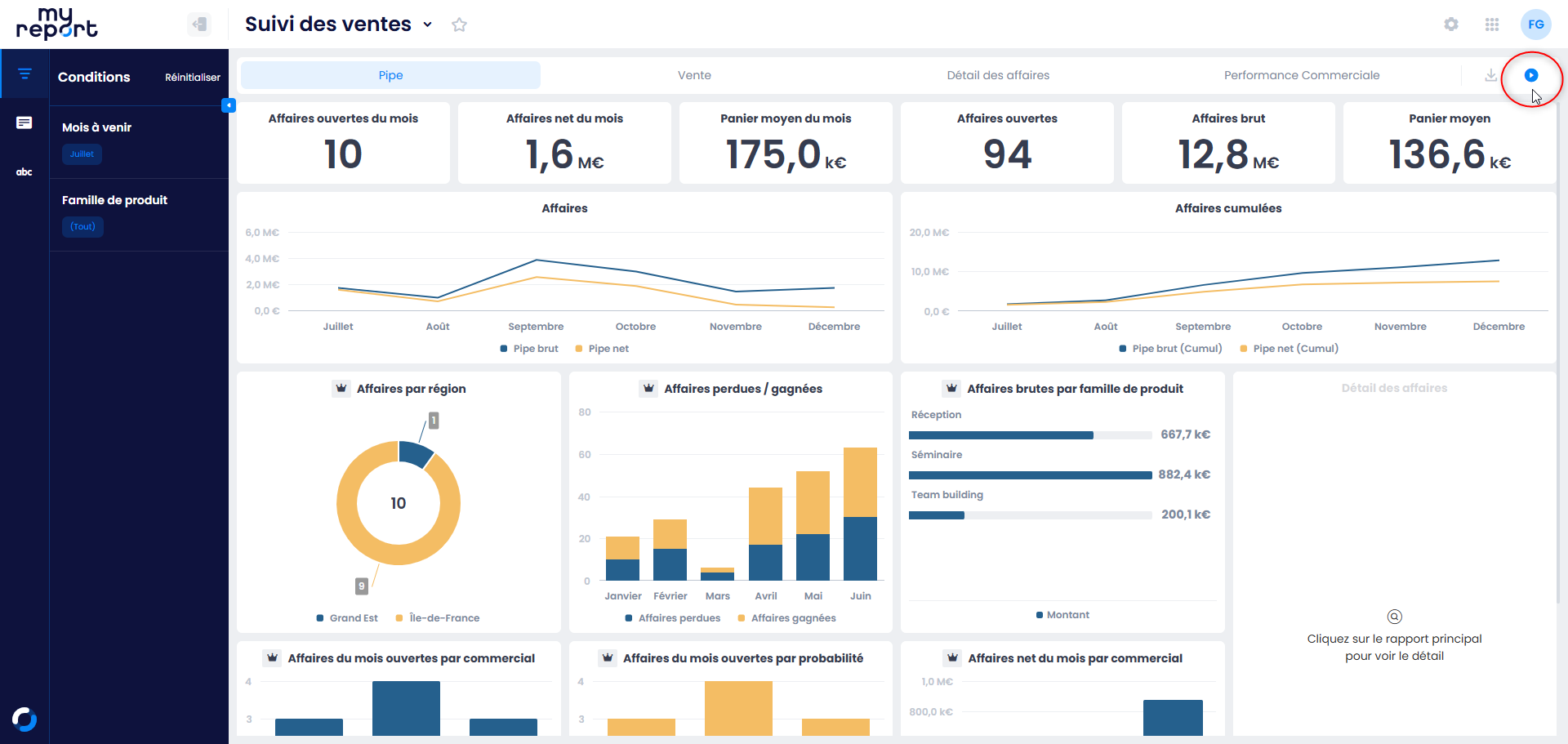 Sur chaque rapport d'un tableau de bord vous avez la possibilité d'ouvrir le rapport avec MyReport Page ou MyReport Builder sans avoir besoin d'ouvrir le produit depuis votre ordinateur.