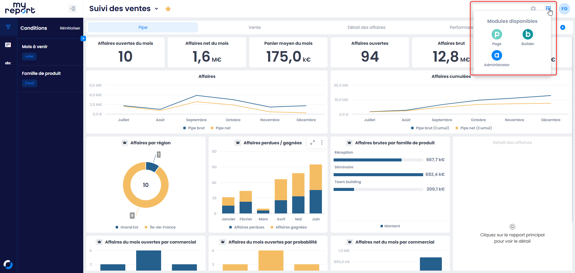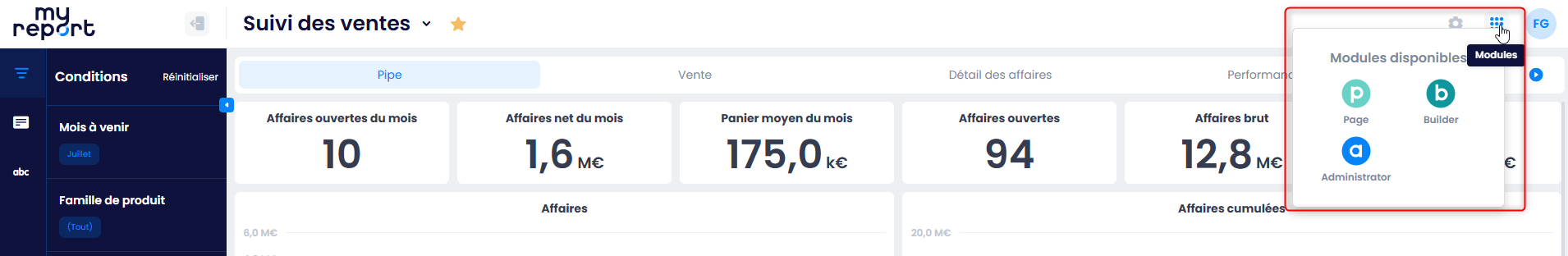 situé en haut à droit permet d'ouvrir les modules disponibles : MyReport Page, Builder ou Administrator directement depuis Center !