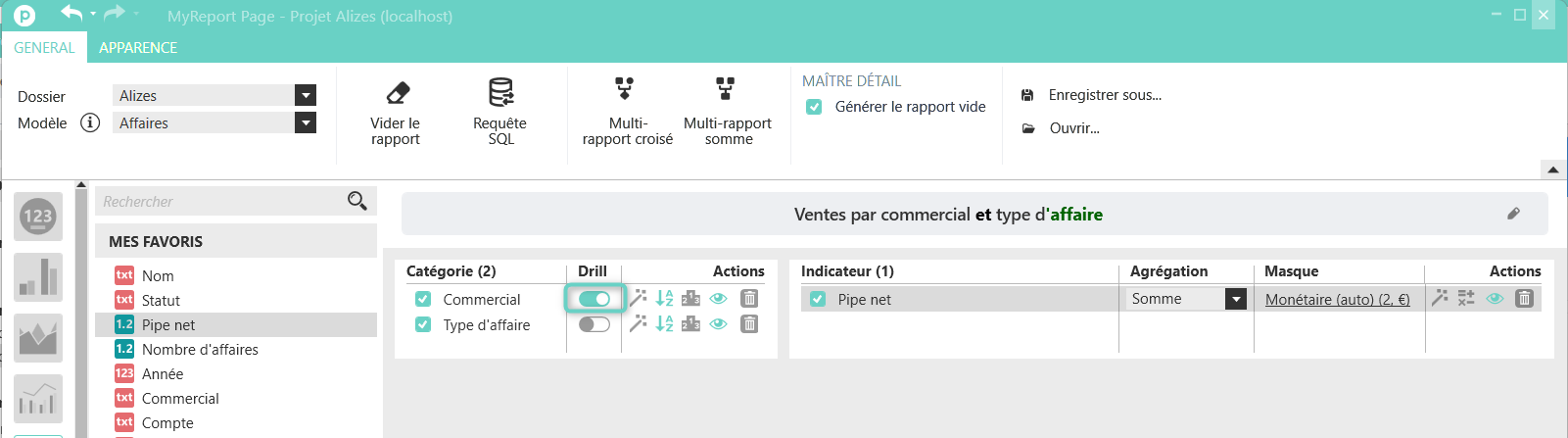 Sur tous les types de rapport (sauf le KPI et le Texte), il est possible de regrouper les données. On parle alors de la fonction Drill.