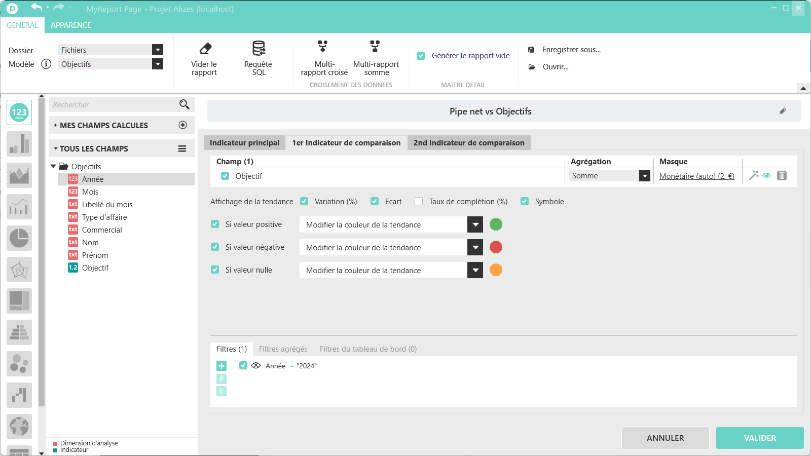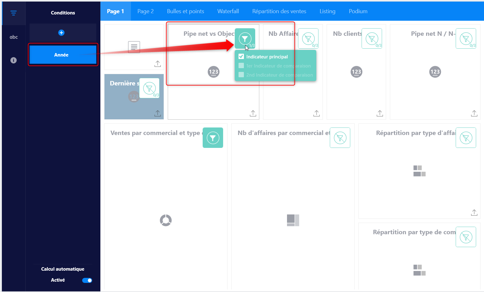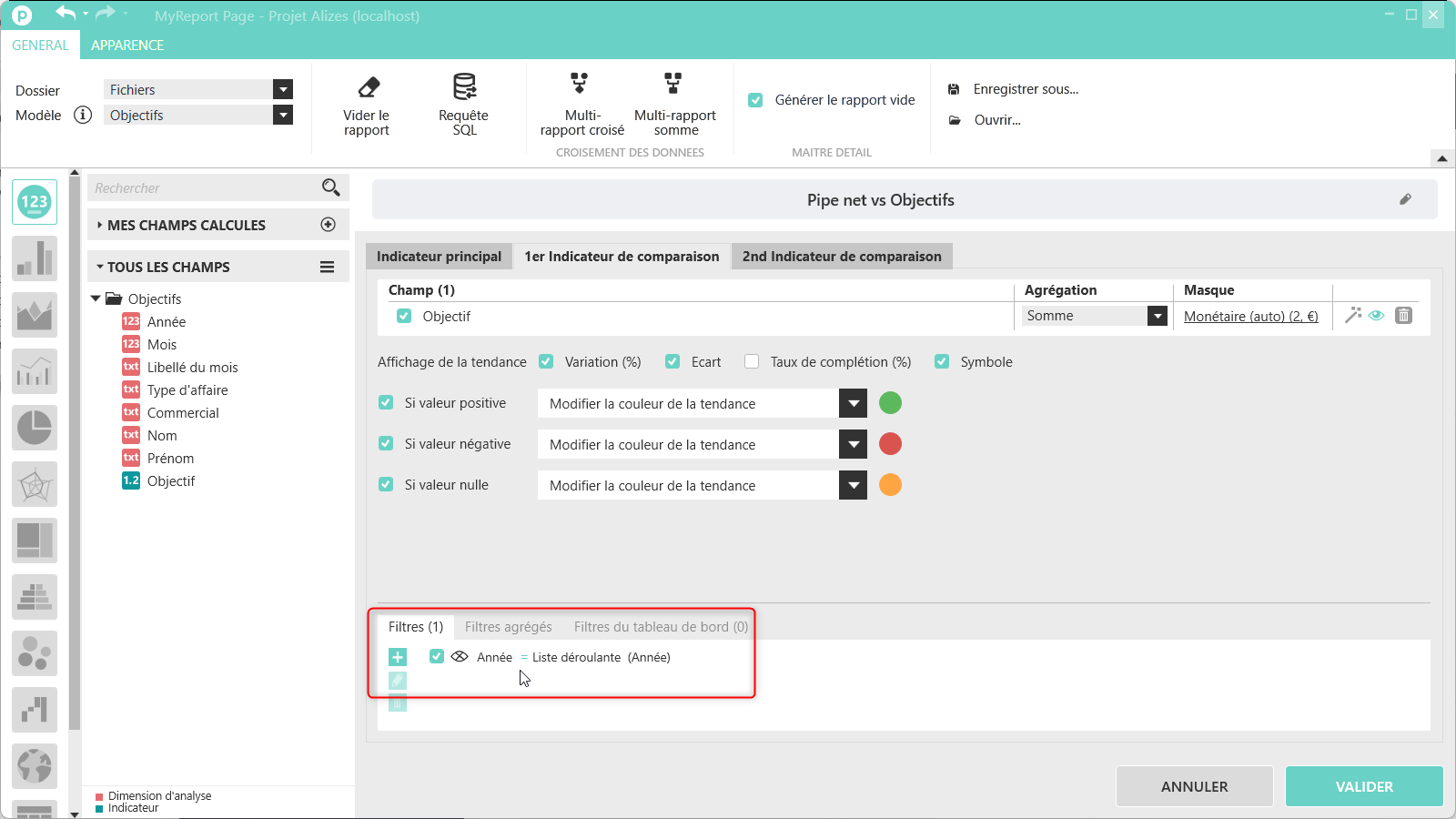 La condition peut même s'afficher dans le titre du KPI Pipe net vers Objectifs en mettant le texte entre guillemets et en ajoutant la formule vue au chapitre précédent concernant les titres : &ZoneTexte(Année).