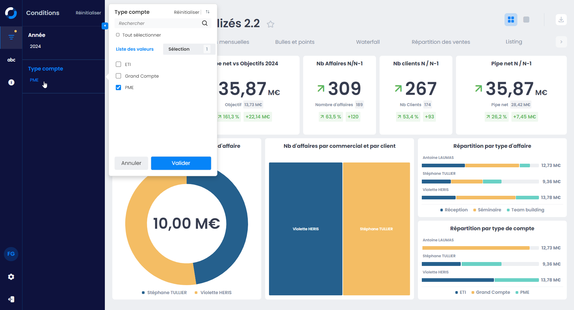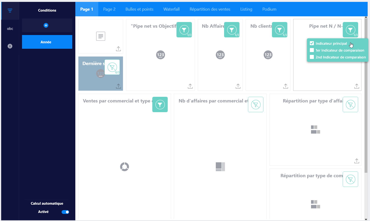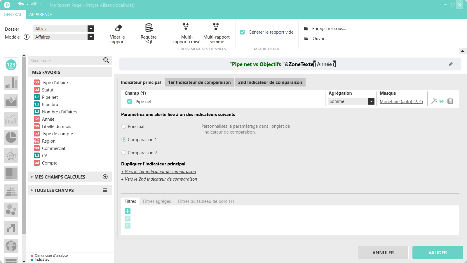La condition peut même s'afficher dans le titre du KPI Pipe net vers Objectifs en mettant le texte entre guillemets et en ajoutant la formule vue au chapitre précédent concernant les titres : &ZoneTexte(Année).