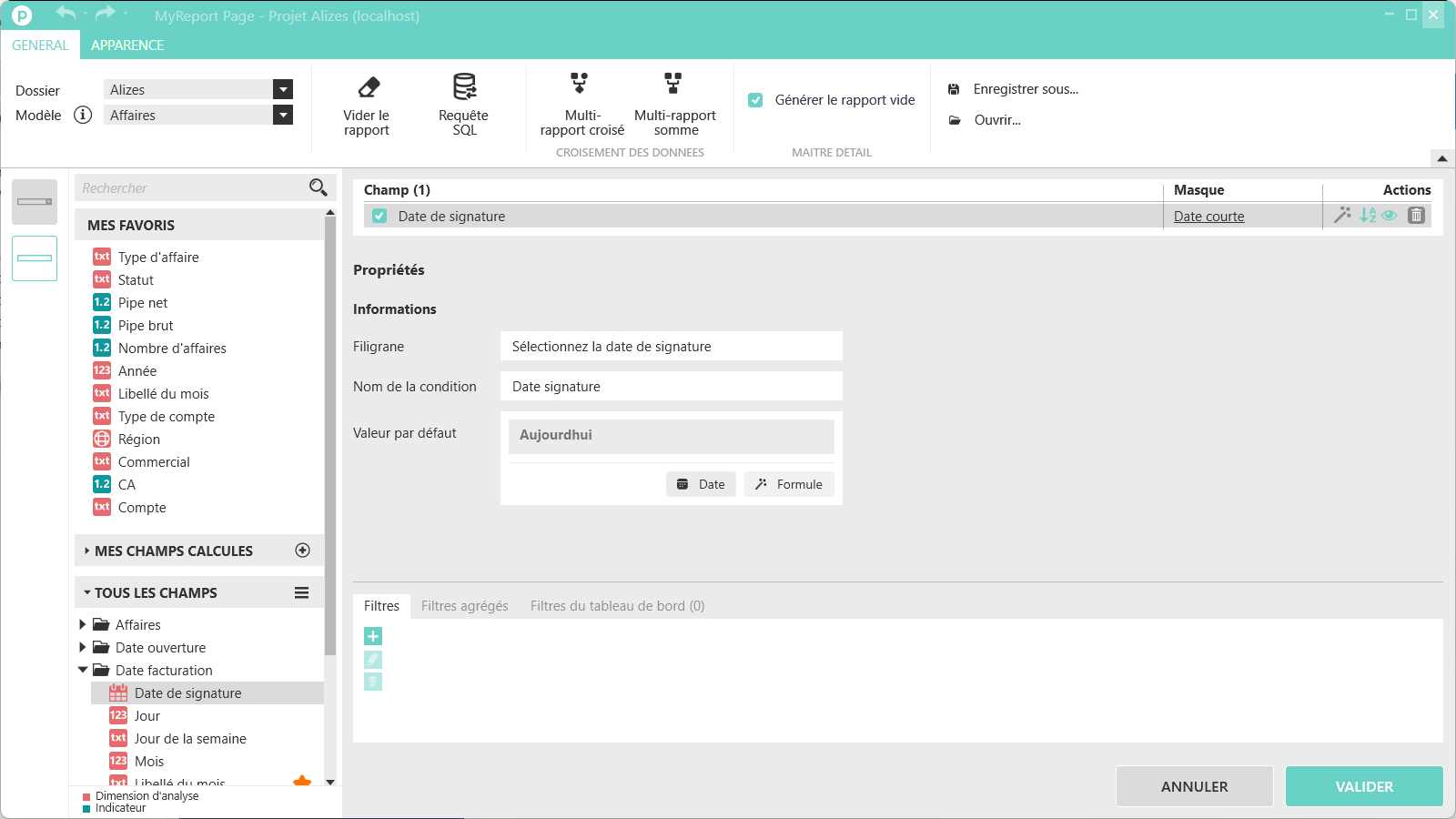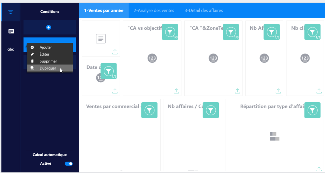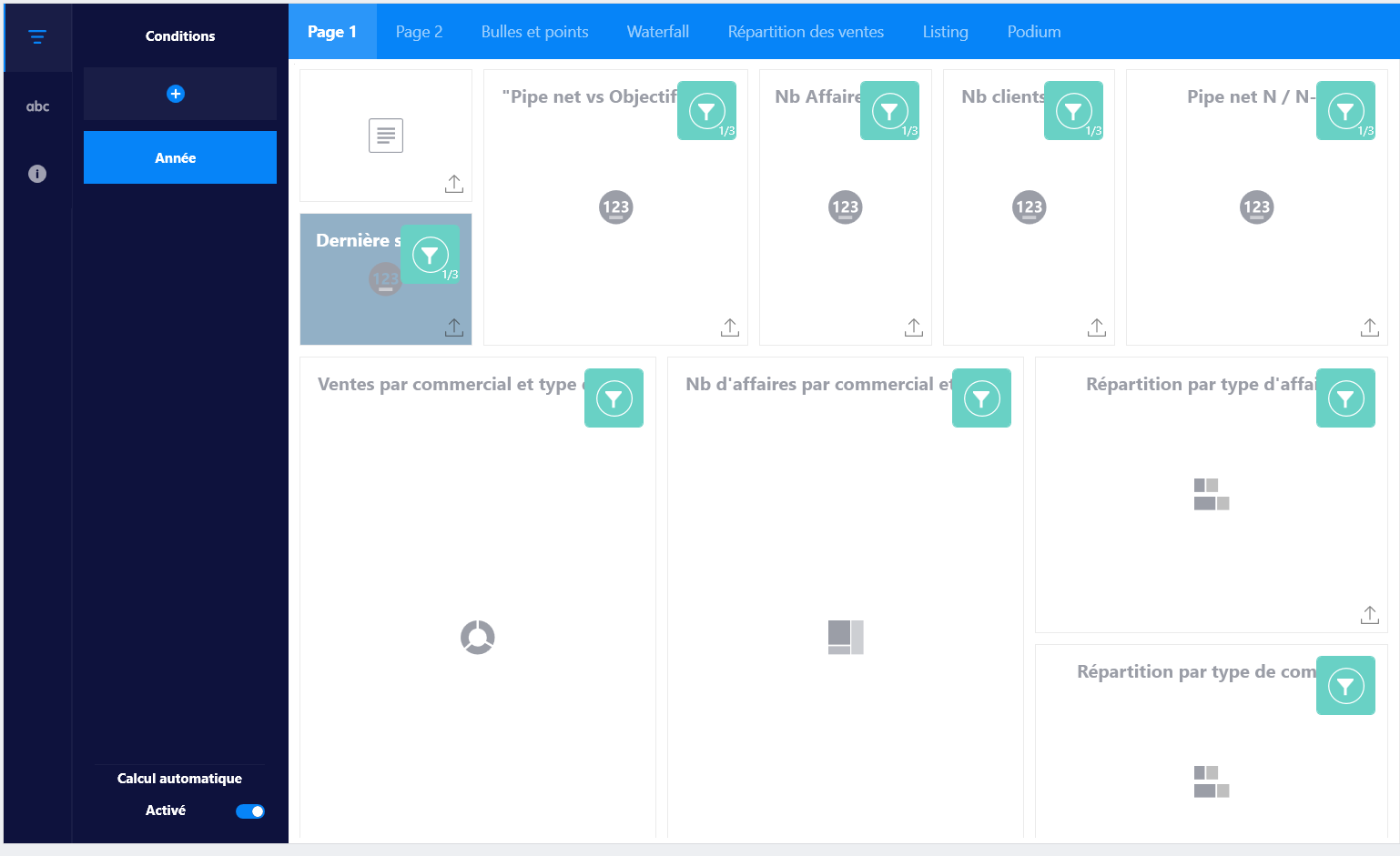 Les « conditions » sont également appelées les « Filtres du tableau de bord ». Vous retrouvez d'ailleurs cet onglet dans chaque rapport. Les conditions seront activables si et seulement si elles utilisent le même modèle que le rapport. Sinon, il faudra créer un filtre de type valeurs dynamiques.