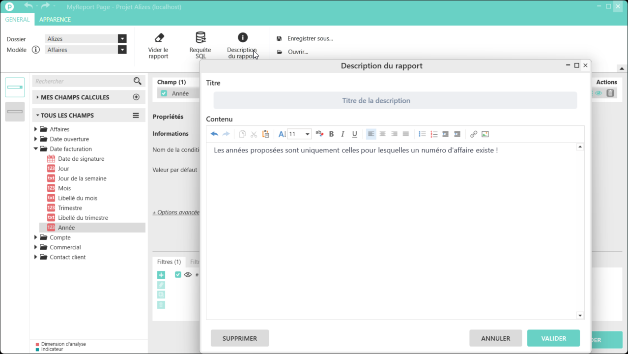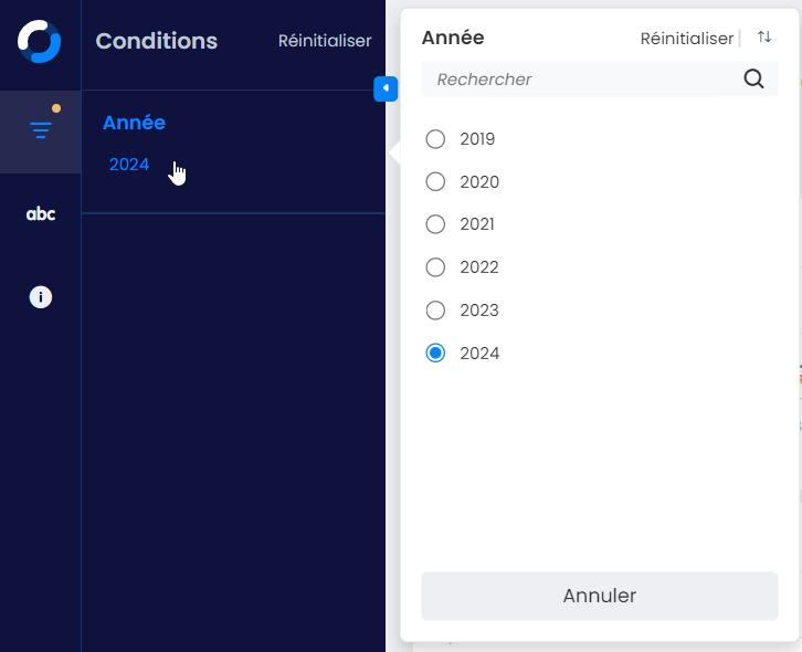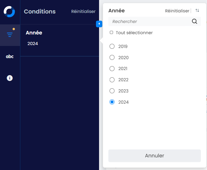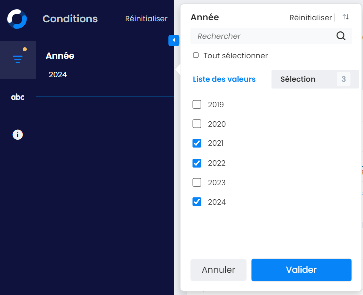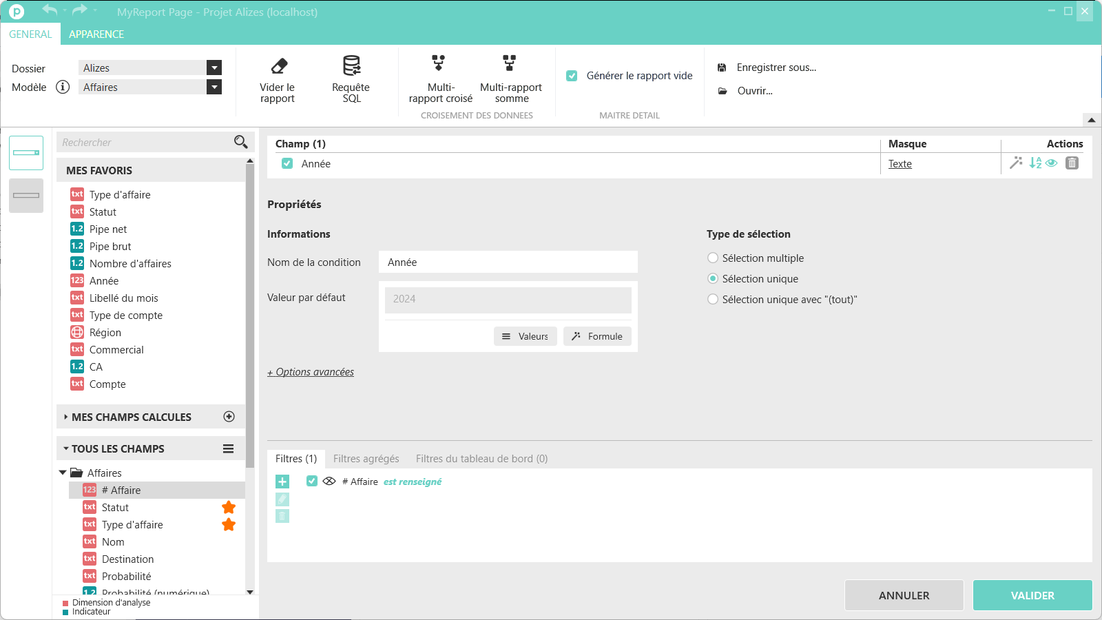 Si votre modèle possède un grand nombre d'années, nous vous recommandons d'ajouter un filtre à la condition, comme par exemple Année comprise entre 2019 et 2024, ou encore #Affaire Est renseigné. Ce qui limitera le nombre d'années sélectionnables dans la condition.