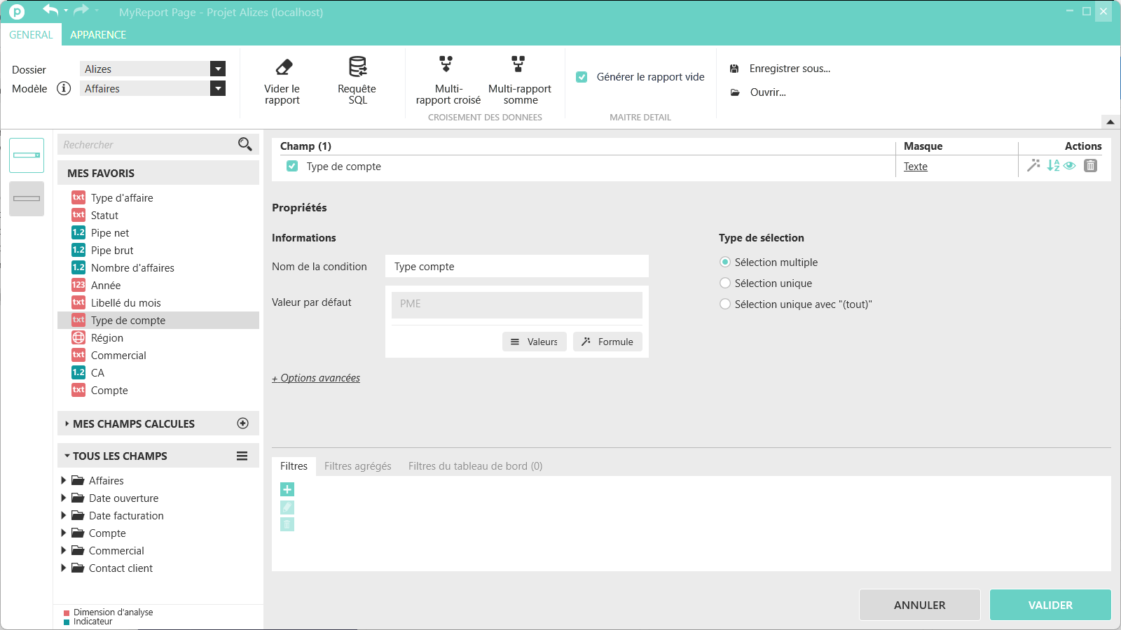 Pour faire un autre type de filtre ("Commence par", "Compris entre", "Supérieur à", "Inférieur à"...), ou sur un autre champ, vous devez définir un filtre dynamique classique dans l'onglet « Filtres » du rapport.
