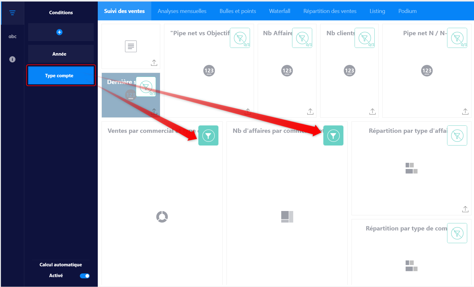 - Ou ouvrir un des rapports de la page, et dans l'onglet « Filtres du tableau de bord », cocher la Liste déroulante Type compte.