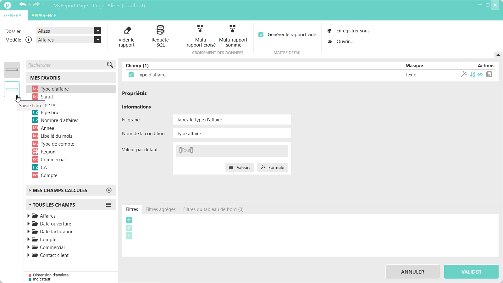 La condition Saisie Libre comme son nom l'indique permettra à l'utilisateur de saisir la valeur qu'il souhaite pour filtrer son ou ses rapports. Attention, il devra saisir la valeur exactement attendue, à la casse près (Majuscule/minuscule) !
