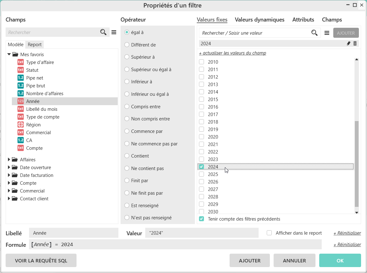 Sélectionnez le champ Année du modèle Affaires, puis l'opérateur « égal à » . Cliquez ensuite sur « Valeurs fixes »,cochez la valeur 2024 et validez en cliquant sur le bouton OK.
