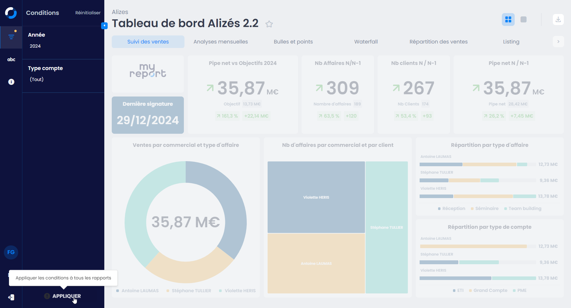Lors de la création du Tableau de bord avec Page, son créateur a pu décocher l'option "Calcul automatique" des conditions. Dans ce cas, après avoir sélectionné une ou plusieurs conditions dans MyReport Center, vous devrez cliquer sur le bouton Appliquer pour appliquer vos choix aux rapports concernés. Nota : Le bouton Appliquer dans les conditions dans MyReport Center ne s'affiche que si le tableau de bord contient au minimum deux conditions. Nous vous conseillons cette option uniquement pour des raisons de performance sur des tableaux de bord ayant un grand nombre de conditions et de rapports.