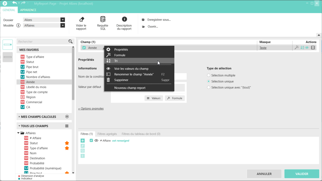 Les données de cette condition peuvent être triées de façon croissante, décroissante, ou de façon personnalisée. Effectuez un clic droit sur le champ placé en condition, puis Tri :