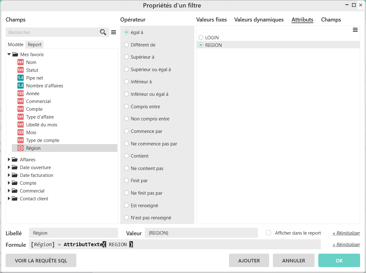 Par exemple, pour construire un rapport n'affichant que les régions de l'utilisateur connecté à MyReport Center, il faudra mettre en place le filtre suivant :