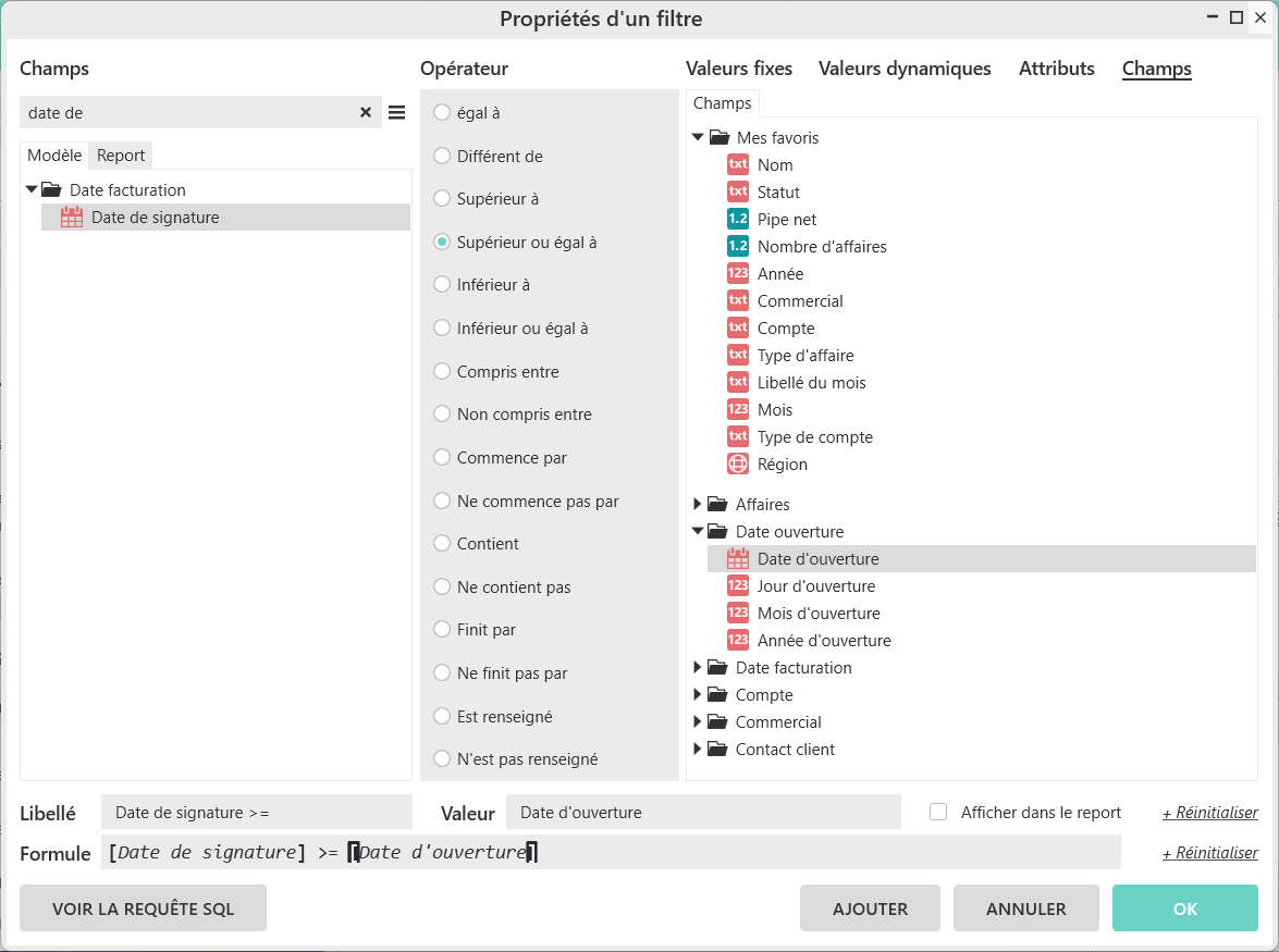 Et en rajoutant +3 à cette formule ( par exemple : [Date de signature] <= [Date d'ouverture]+3), vous n'obtiendrez que les affaires signées 3 jours après leur date d'ouverture.
