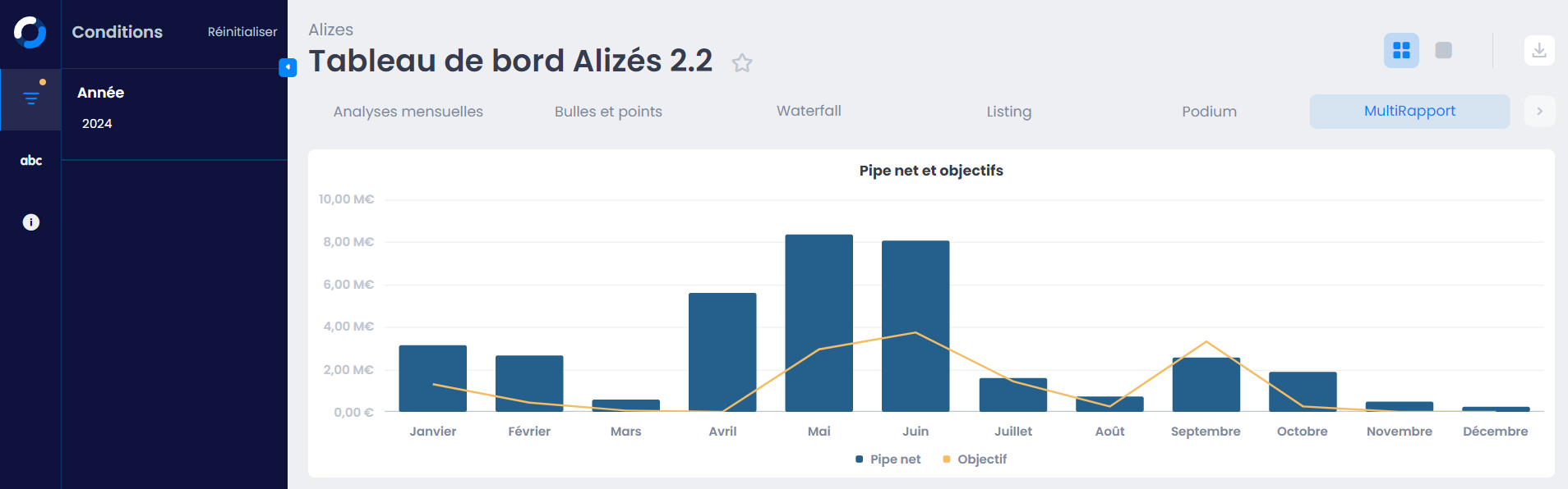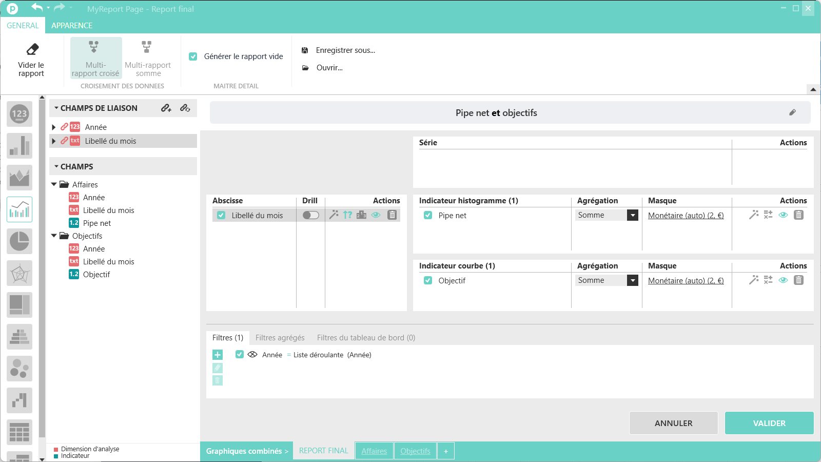 • Dans un Graphique combiné, placez les champs : « Libellé du mois » en abscisse, « Pipe net » en Indicateur histogramme, « Objectif » en Indicateur courbe.