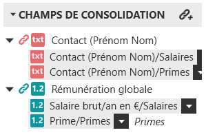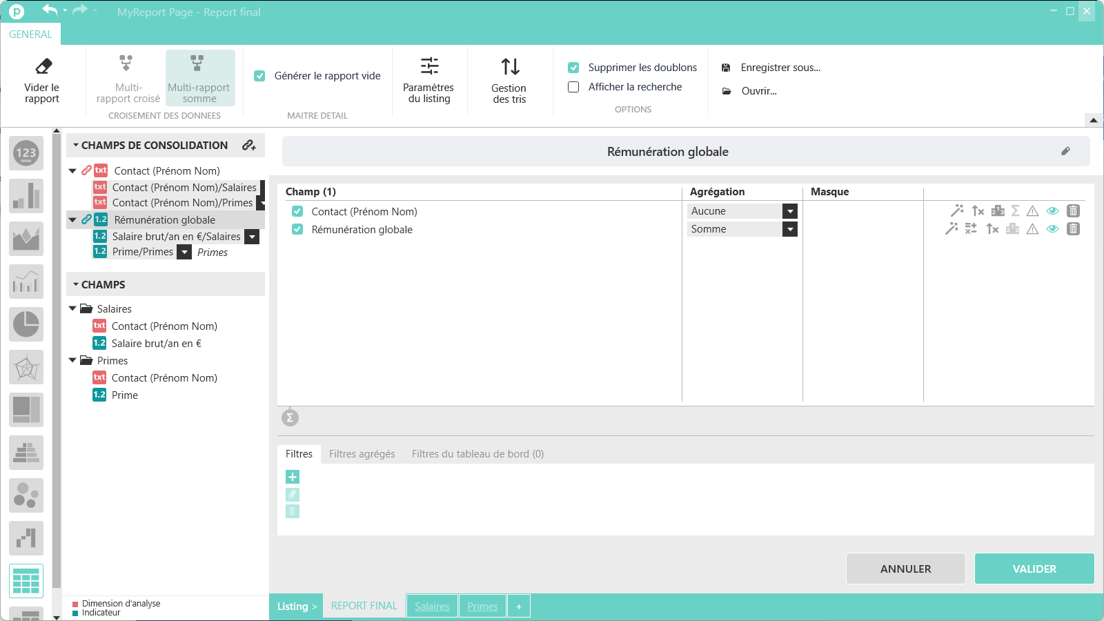 • Remarquez en haut à gauche du report final que le champ de consolidation « Contact (Prénom Nom) » entre les sous-rapports 1 et 2 a été automatiquement créé. Cela est dû au fait que le champ Contact (Prénom Nom) des 2 sous-rapports a le même libellé. Mais... vous devez créer le champ de consolidation entre « Salaire brut/an en € » et « Prime » afin que le multi-rapport les consolide.