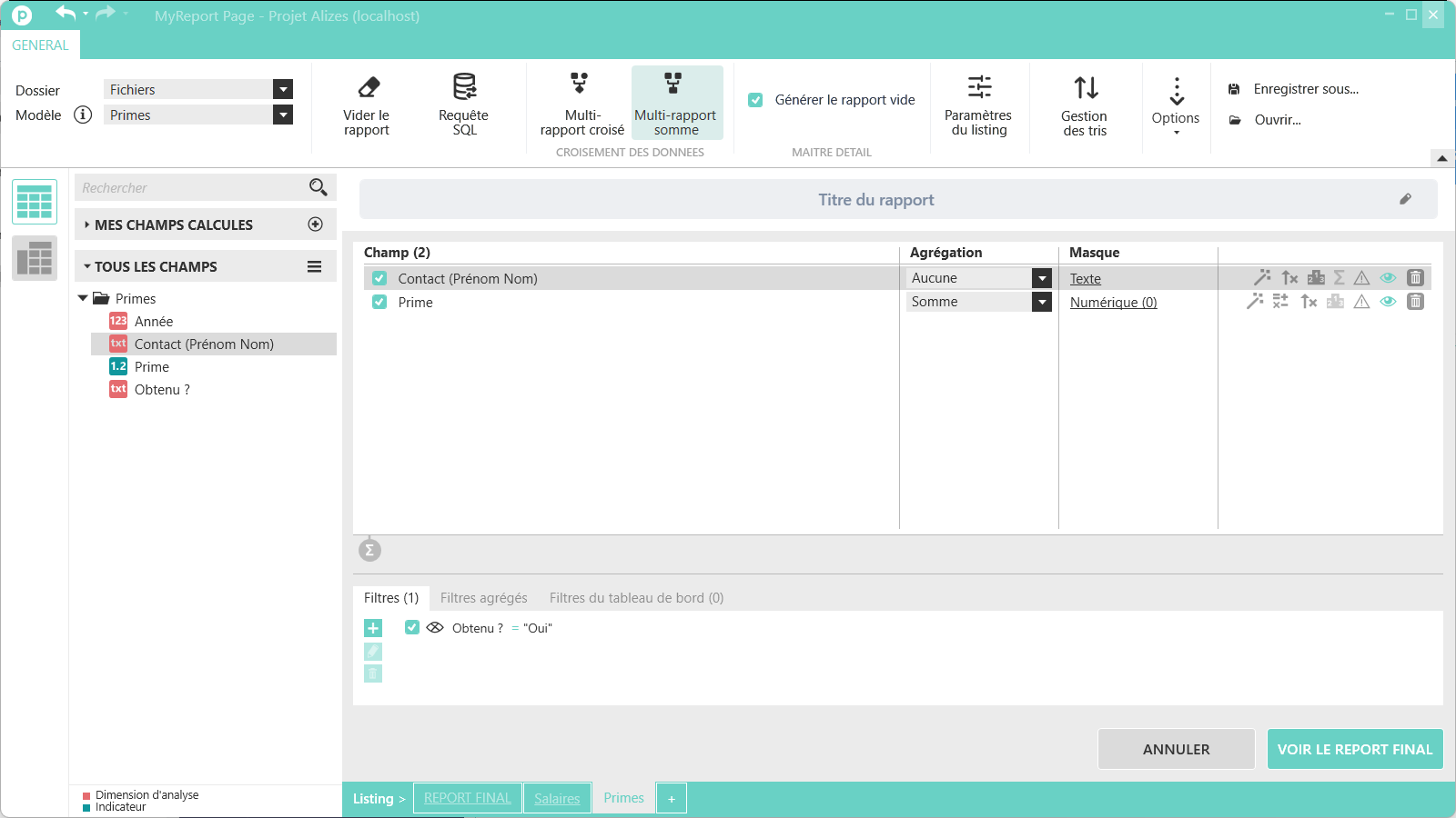Le but d'un multi-rapport Somme est de sommer les montants de modèles différents (Salaires du modèle Contacts et Primes du modèles Primes par exemple). Vous allez créer un listing affichant la rémunération globale des collaborateurs d'Alizés.
