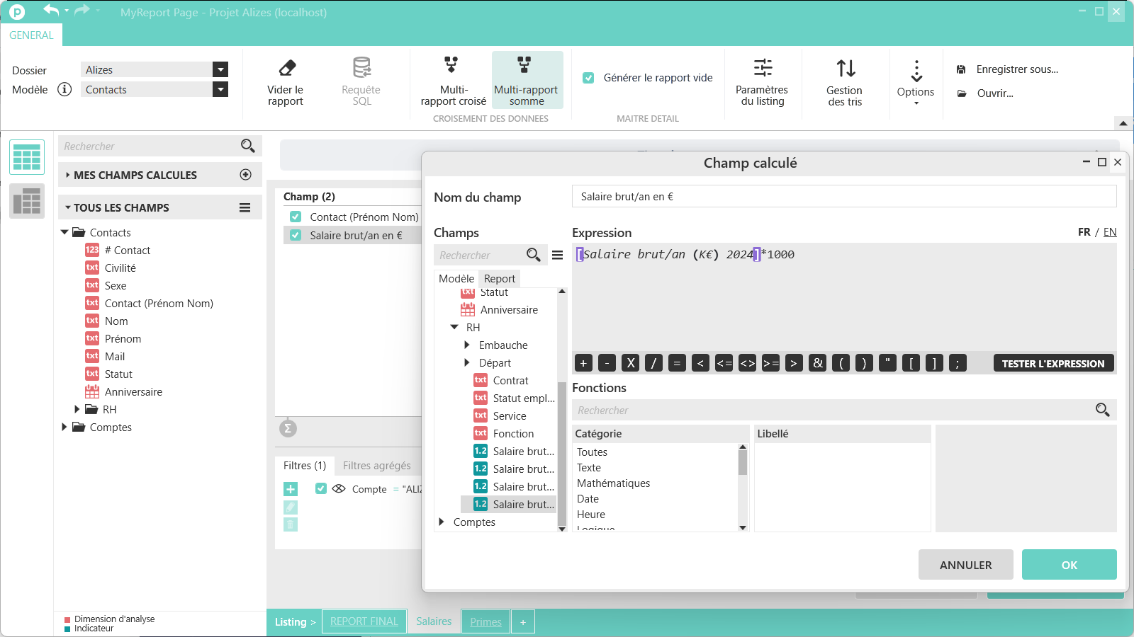 • Pour le sous-rapport Salaires, créez un listing avec le modèle Contacts : ajoutez le champ « Contact (Prénom Nom) » et créez un Nouveau champ report nommé « Salaire brut/an en € » avec la formule suivante : [Salaire brut/an (K€) 2024]*1000.