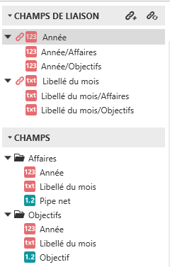 Les liaisons entre les sous-rapports sont créées automatiquement quand les libellés sont identiques dans la partie CHAMPS DE LIAISON :