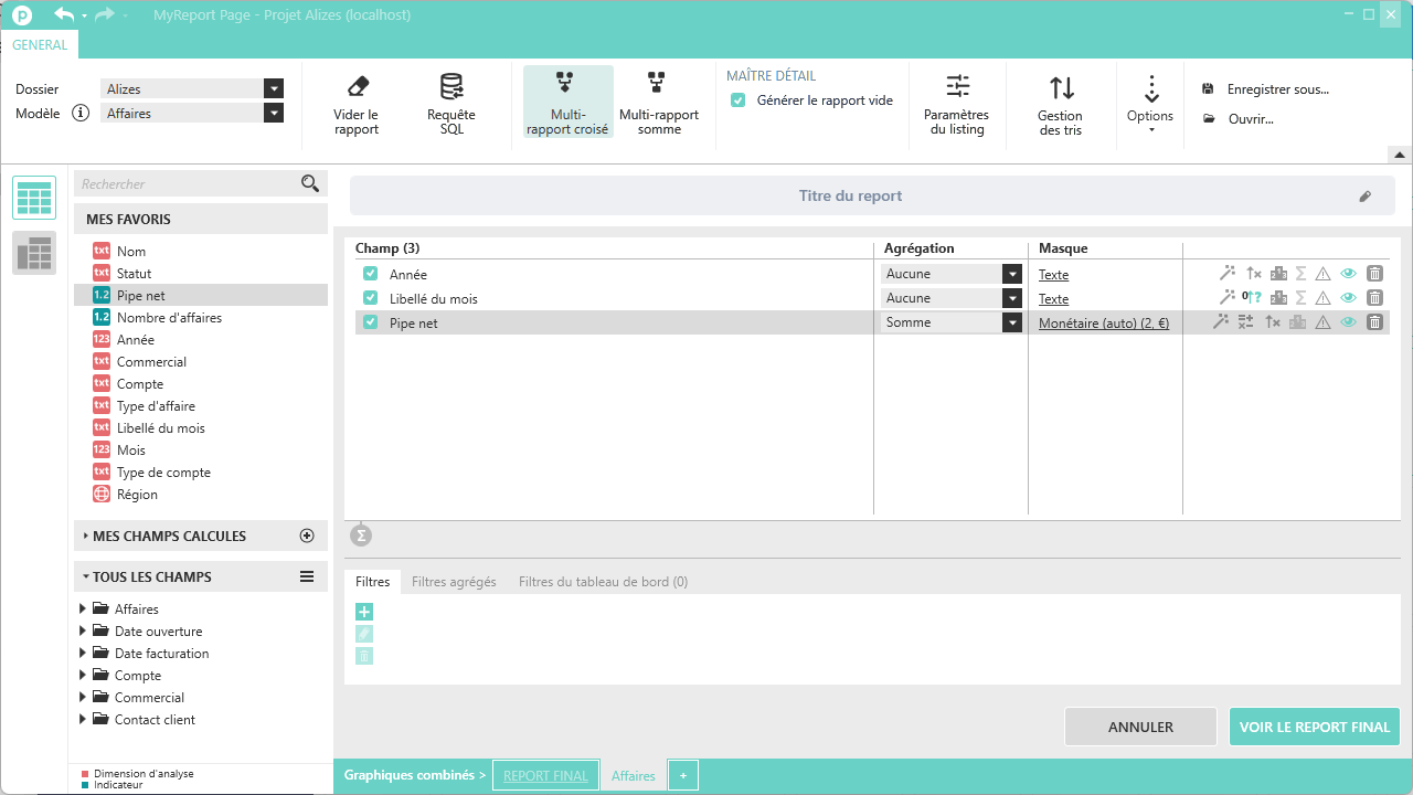 • Pour le sous-rapport Affaires, créez un listing avec le modèle Affaires et sélectionnez les champs « Année », « Libellé du mois » et « Pipe net ».