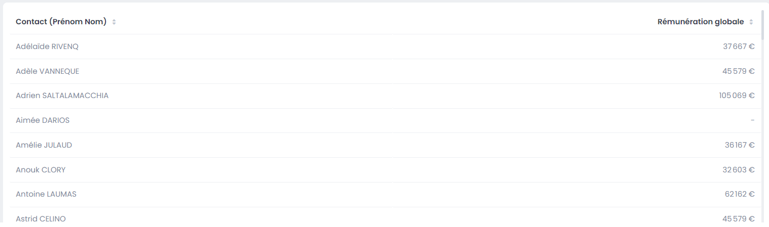 • Dans votre Listing, placez les champs : « Contact (Prénom Nom)  » et... le champ de consolidation « Rémunération globale ».
