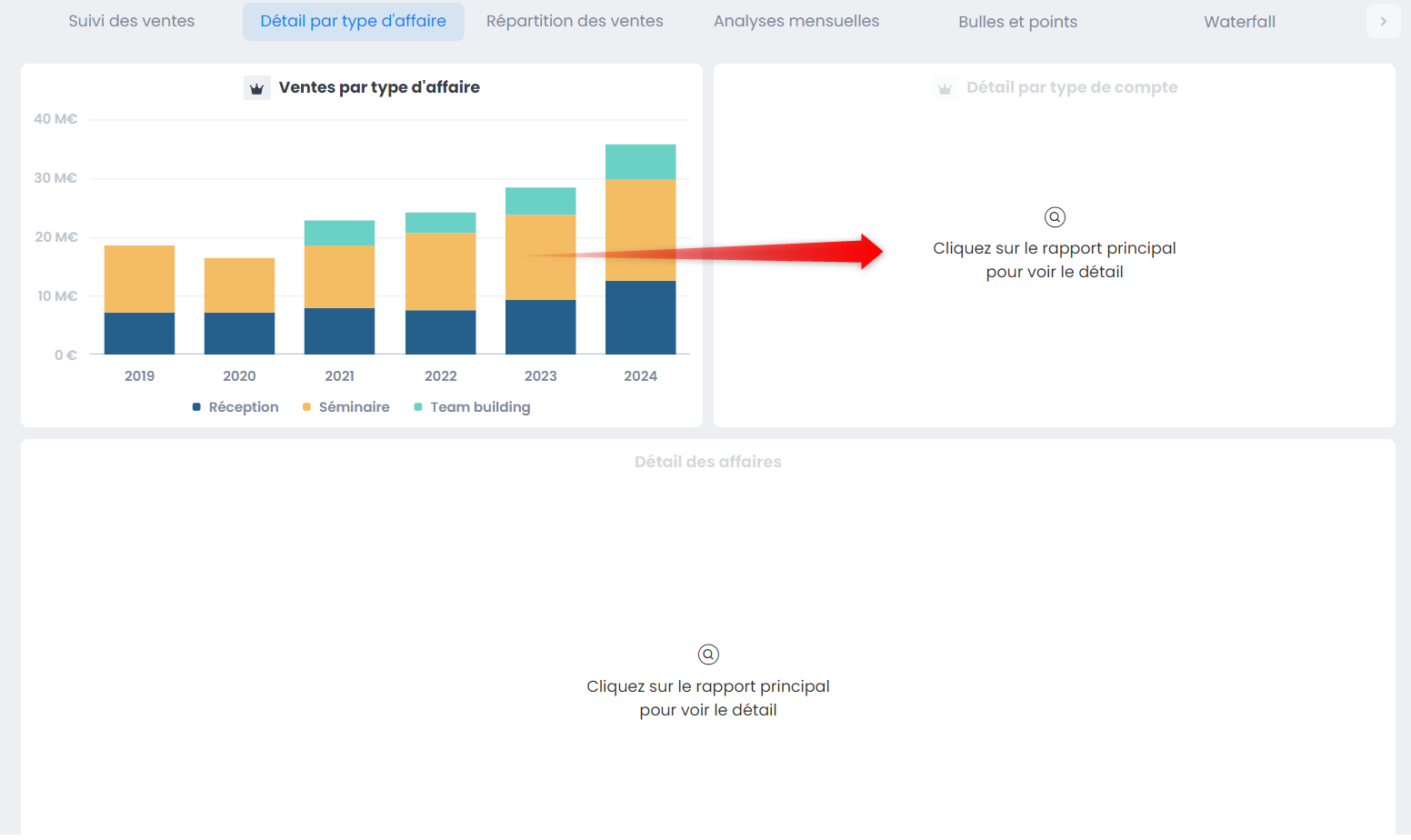 • Sélectionnez le rapport histogramme Ventes par Type d'affaire, et cliquez sur le sur l'icône du rapport de droite Détail par Type de compte. Vous venez de désigner le premier comme étant le Maître du second. Ventes par Type d'affaire est le Maître, Détail par Type de compte est son détail.
