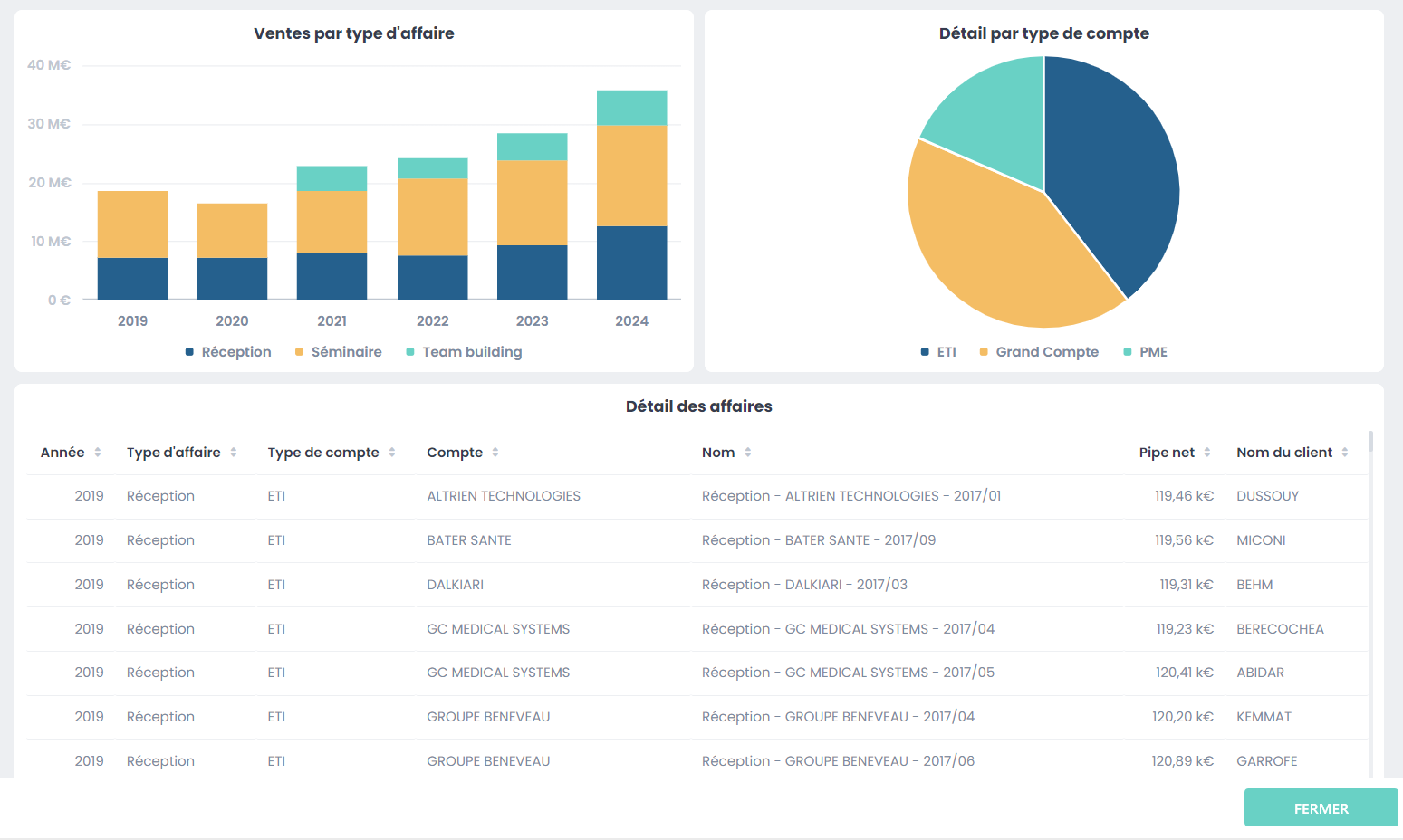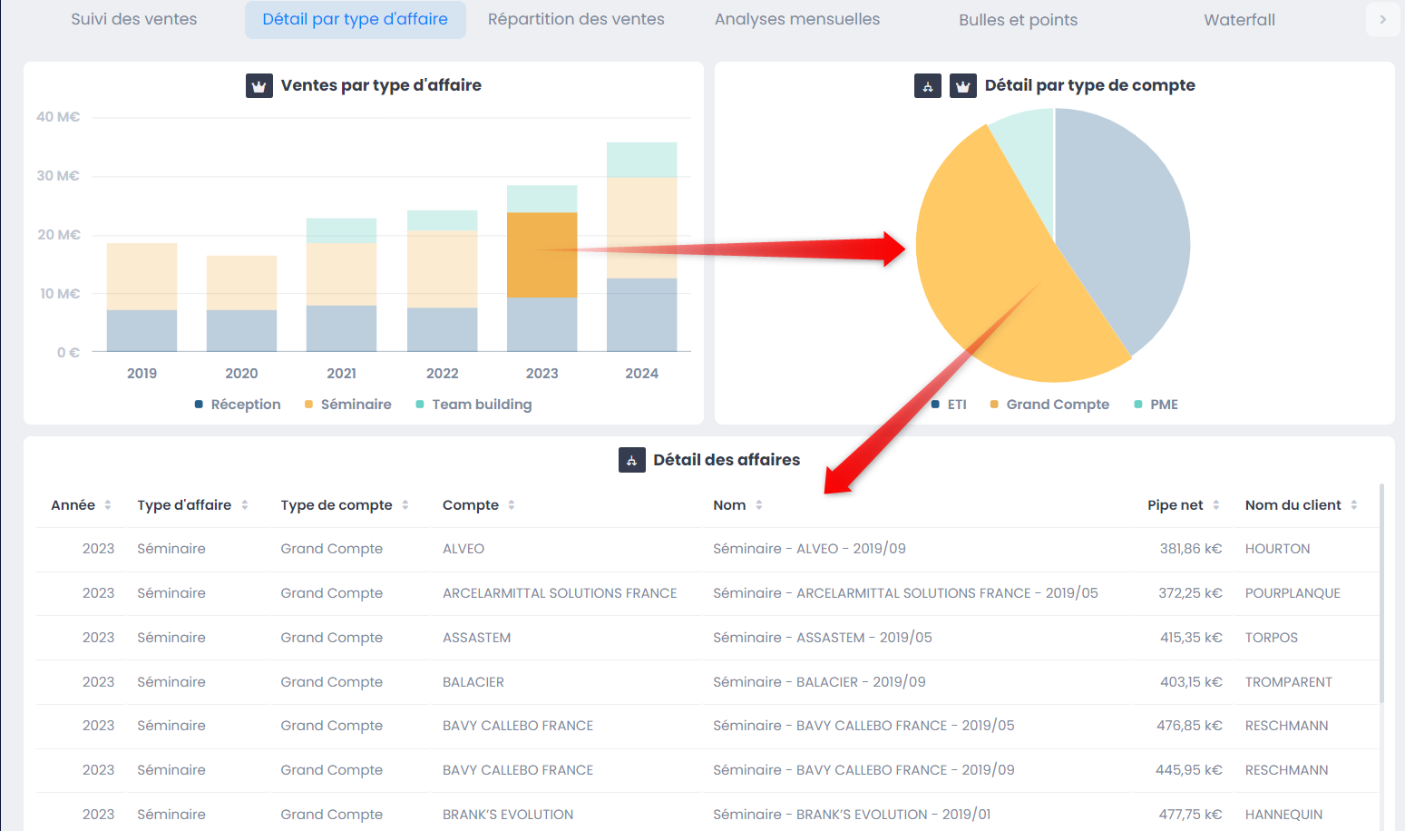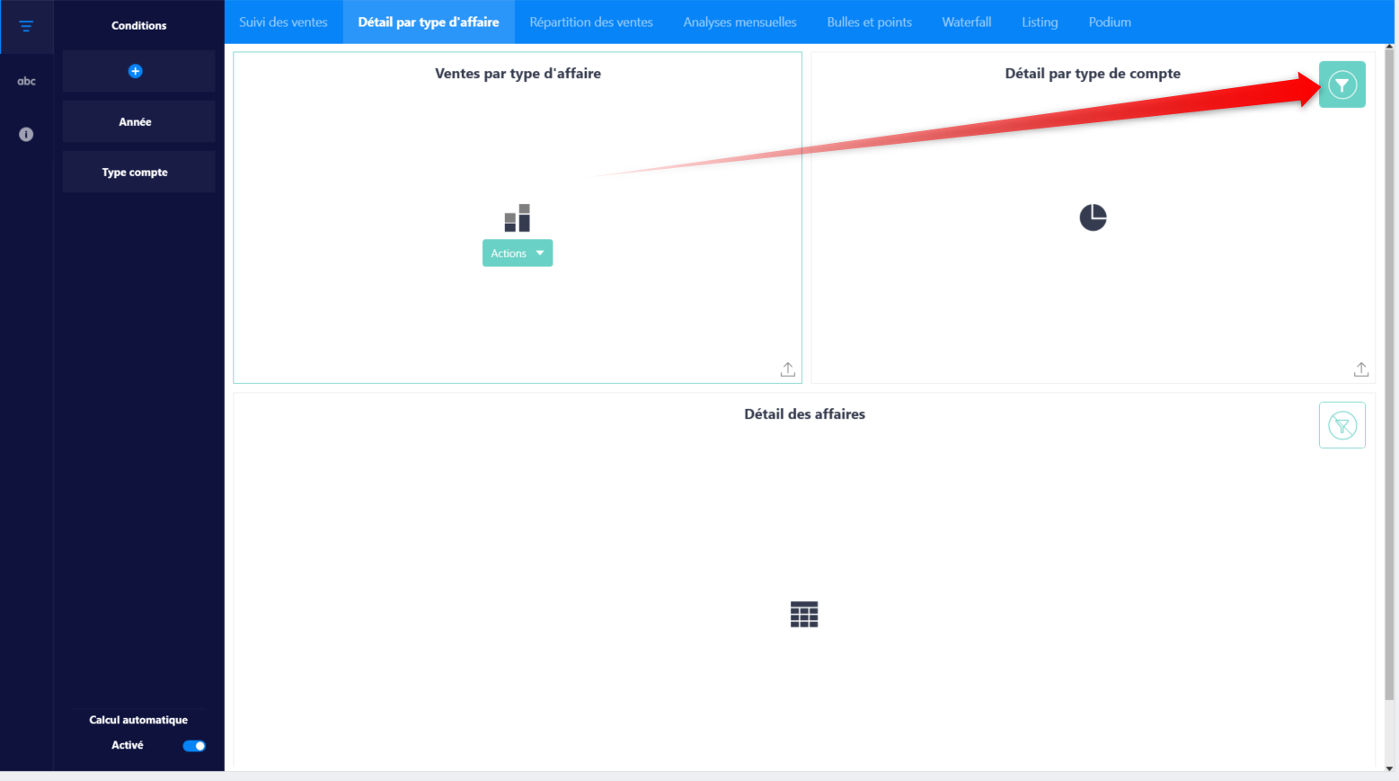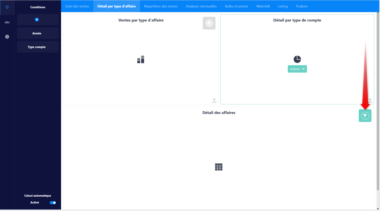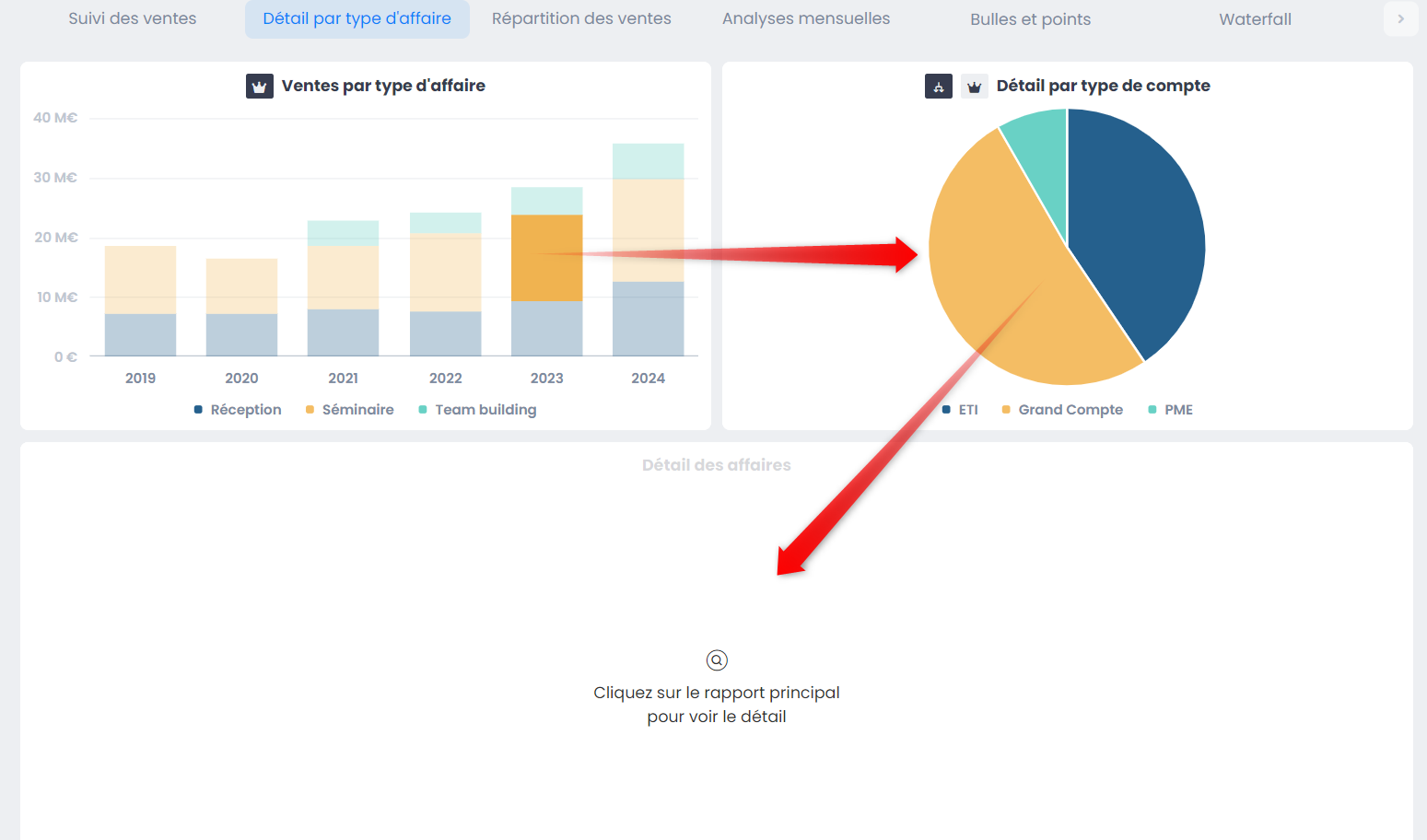 • Sélectionnez le rapport camembert Détail par Type de compte, et cliquez sur le sur l'icône du rapport du bas Détail des affaires. Vous venez de désigner le premier comme étant le Maître du second. Détail par Type de compte est le Maître, Détail des affaires est son détail.