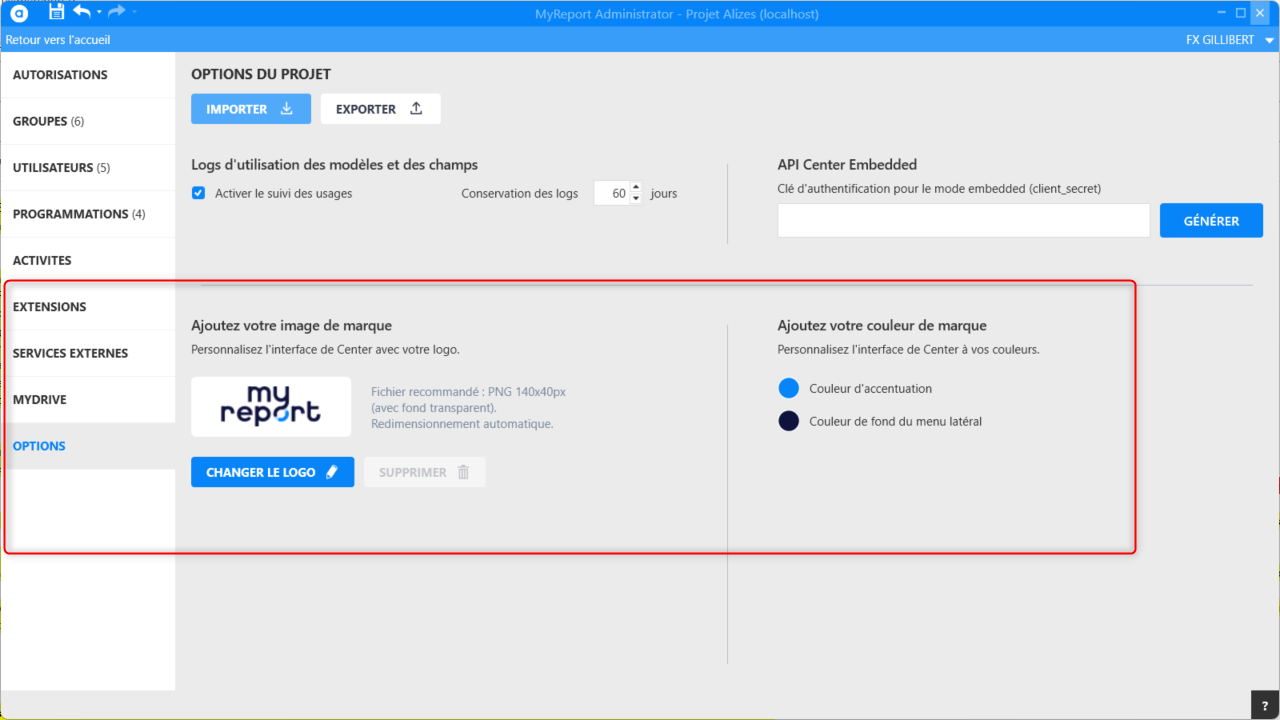 Attention, la personnalisation du logo, de la couleur d'accentuation et de la couleur de fond du menu latéral des tableaux de bord de tout le projet dans Center s'effectuent depuis MyReport Administrator, menu Options :